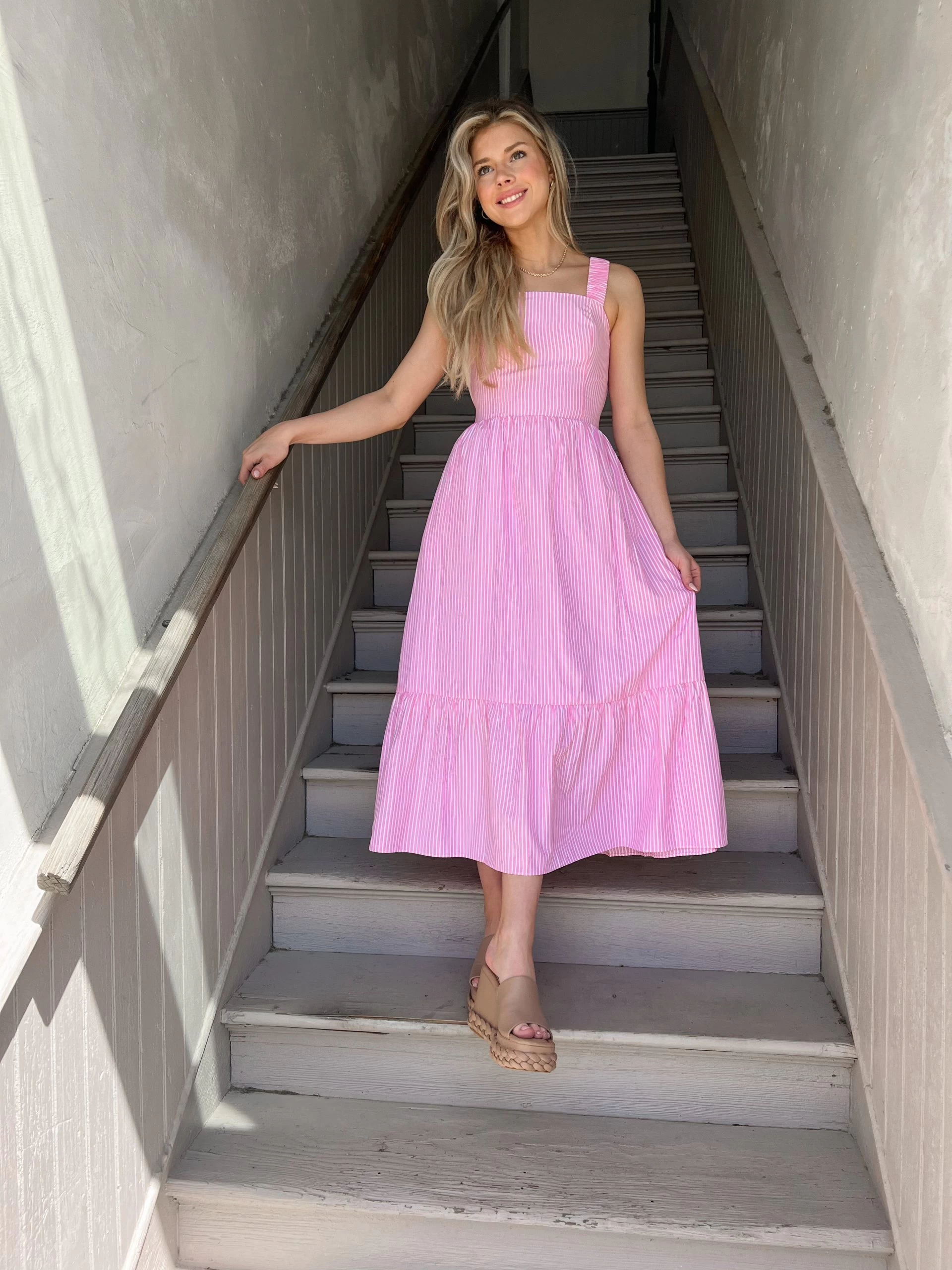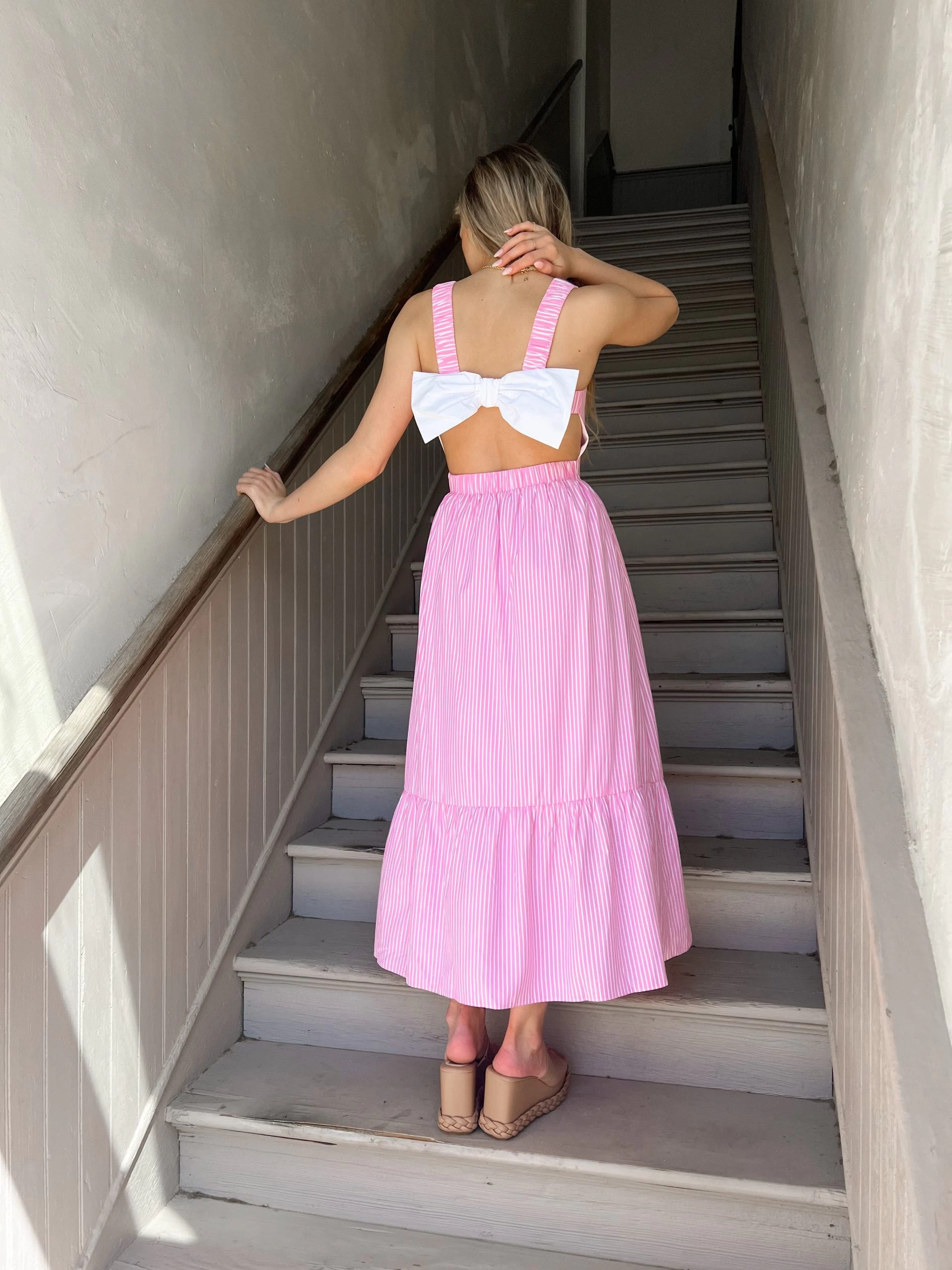 Baby pink pin stripe with ruffle hem detail and all the party is in the back of this dress! Elastic backing with big white bow detail…everyone needs one!