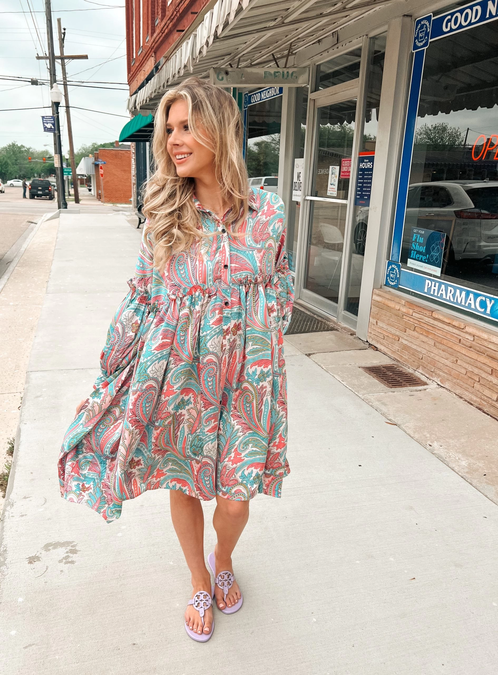 This bright pastel paisley tunic dress is the perfect comfortable summer dress that pairs perfect with sandals, sneakers, and even cowgirl boots! This dress has a button up detail and collared neckline!