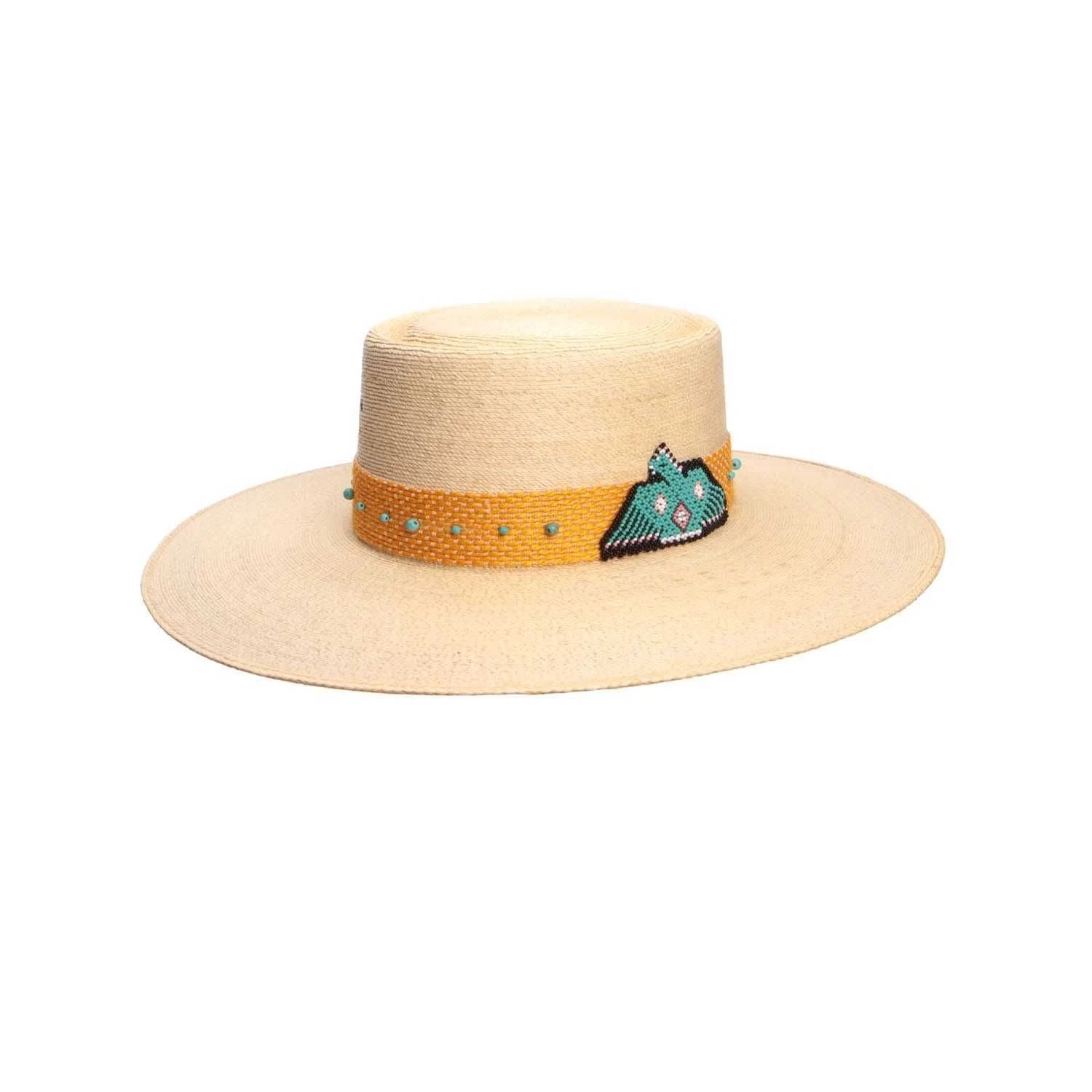 The War Eagle hat by Charlie 1 Horse features straw material, an open face profile, a 4 1/4 inch brim, and a full circle crown that measures 4 inches.  The hatband is an elegant woven material that fits perfectly around the base of the crown and includes a beaded thunderbird and turquoise bead accents. This genuine Charlie 1 Horse hats bears the brand “C,” a sign that you are getting a quality made authentic Charlie 1 Horse hat.  Please note that all hats are branded by hand by a hatmaker at Charlie 1 Horse, with that, all brands are intended to be off-centered.