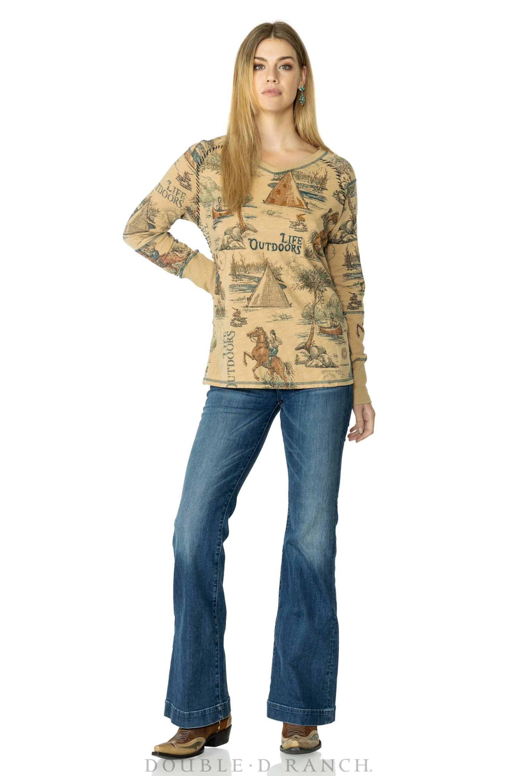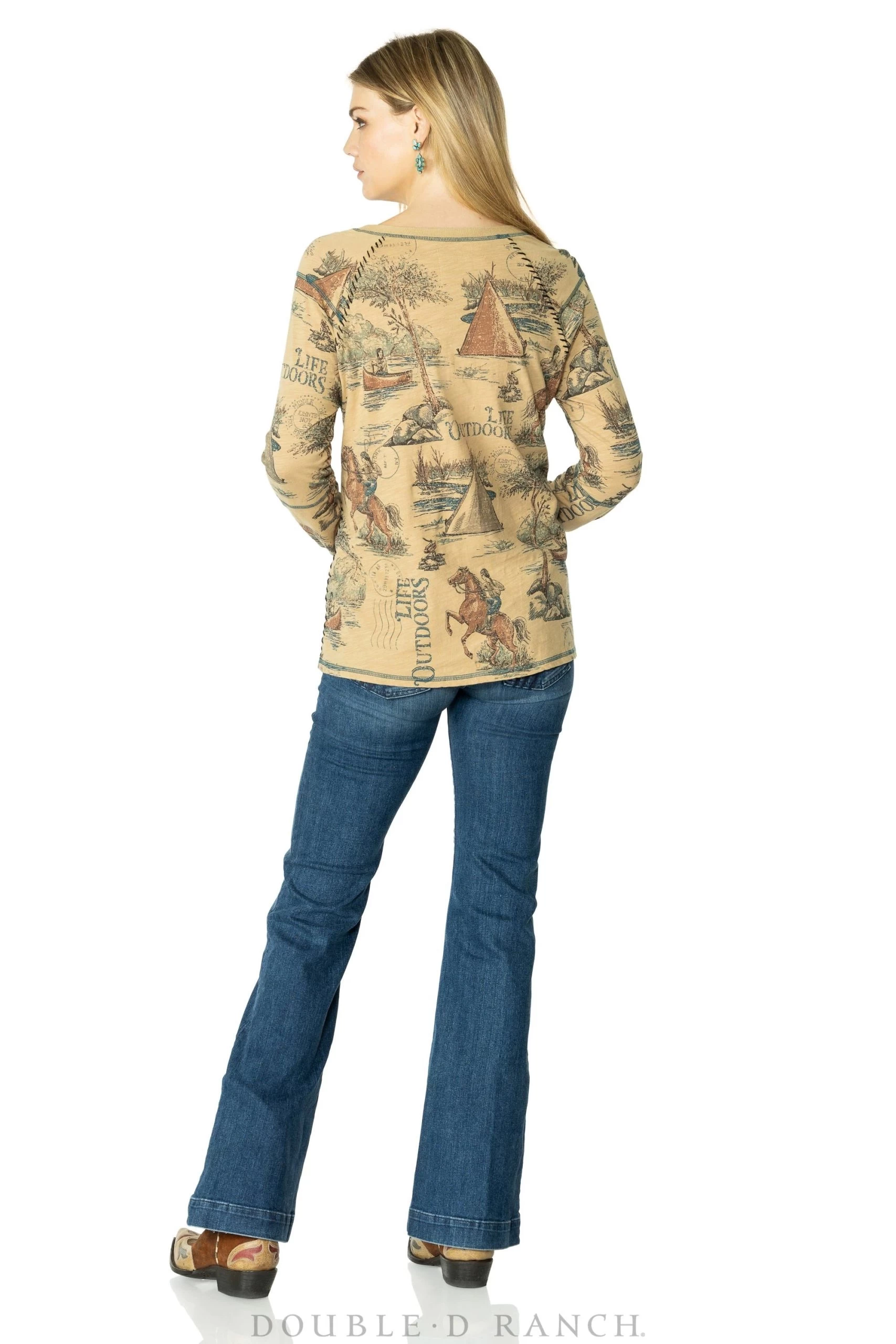 This casual cotton top is a soft hue we call “antelope” adorned with screen-printed imagery of an outdoor camping motif. It’s embellished with embroidery and contrast stitching.