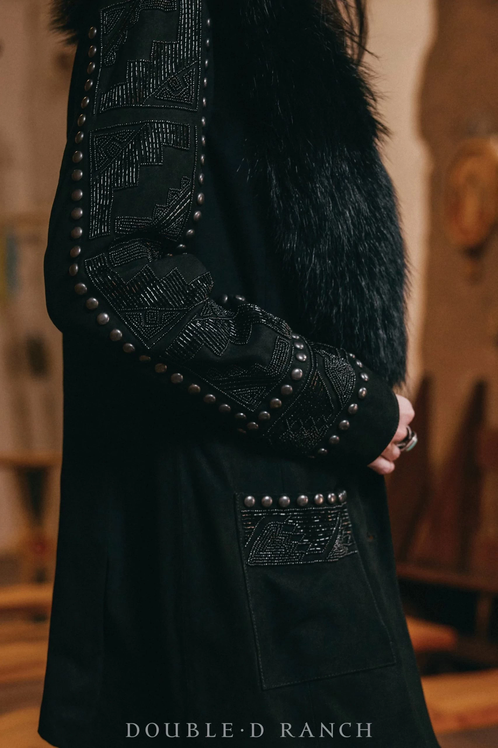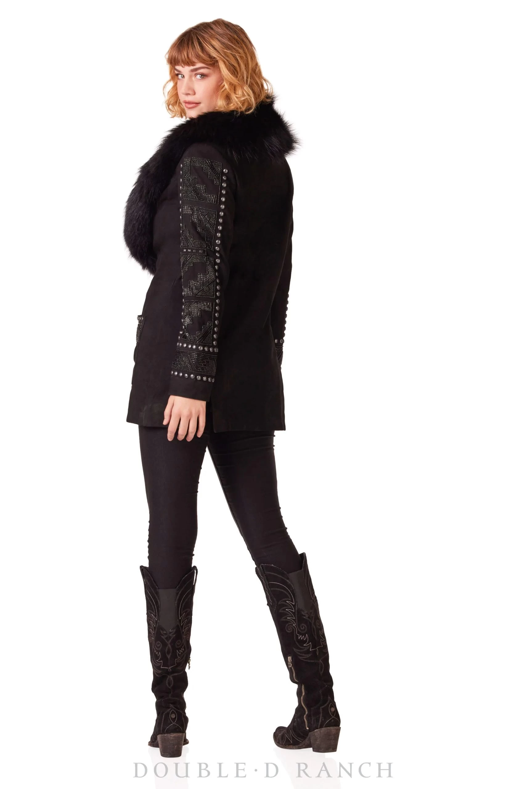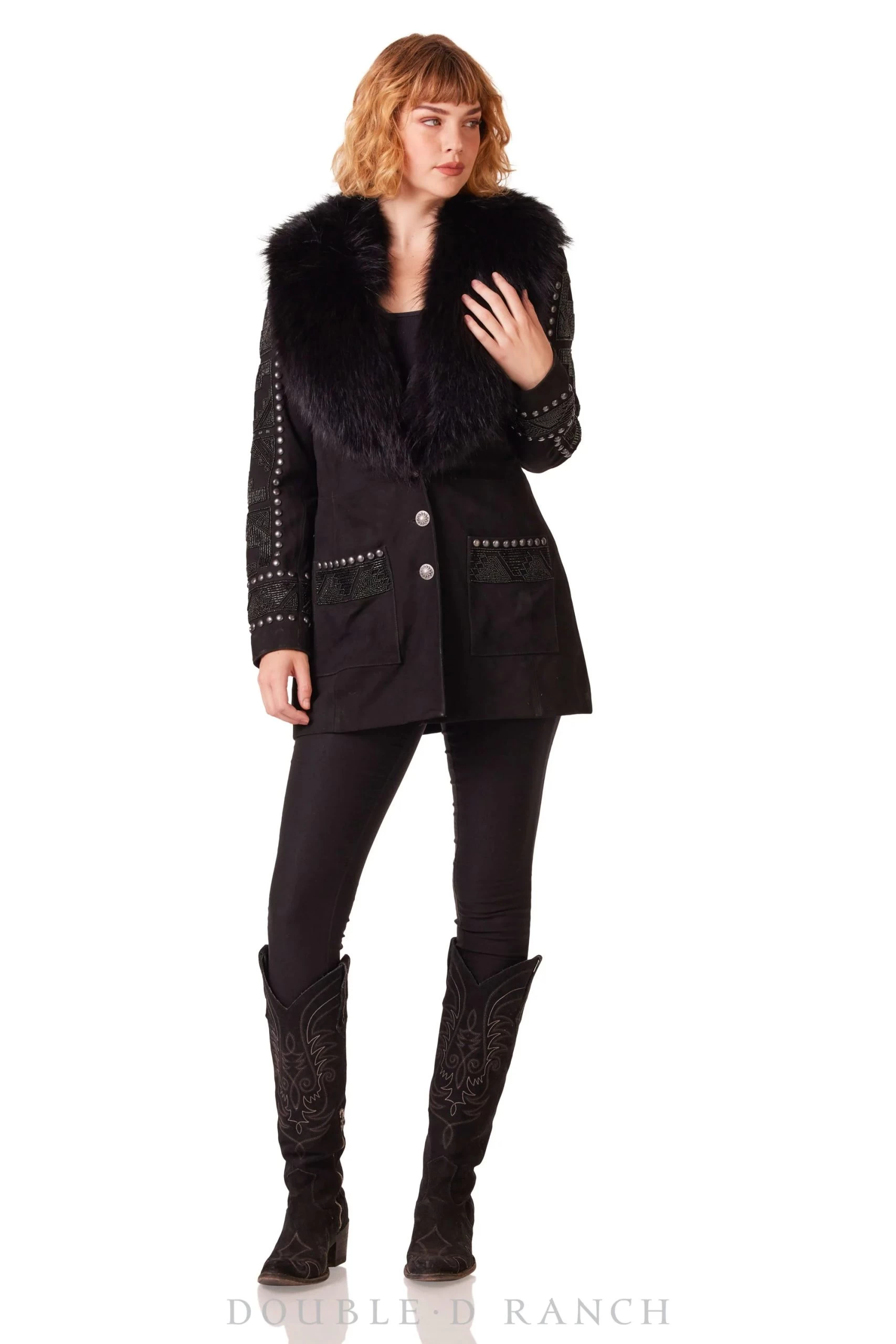 Sometimes an understated jacket can make the strongest statement of all. This bold beauty is perfectly punctuates your look with tonal beadwork and studding, finished with voluminous fur. Stunning and versatile, it’s a timeless must-have.