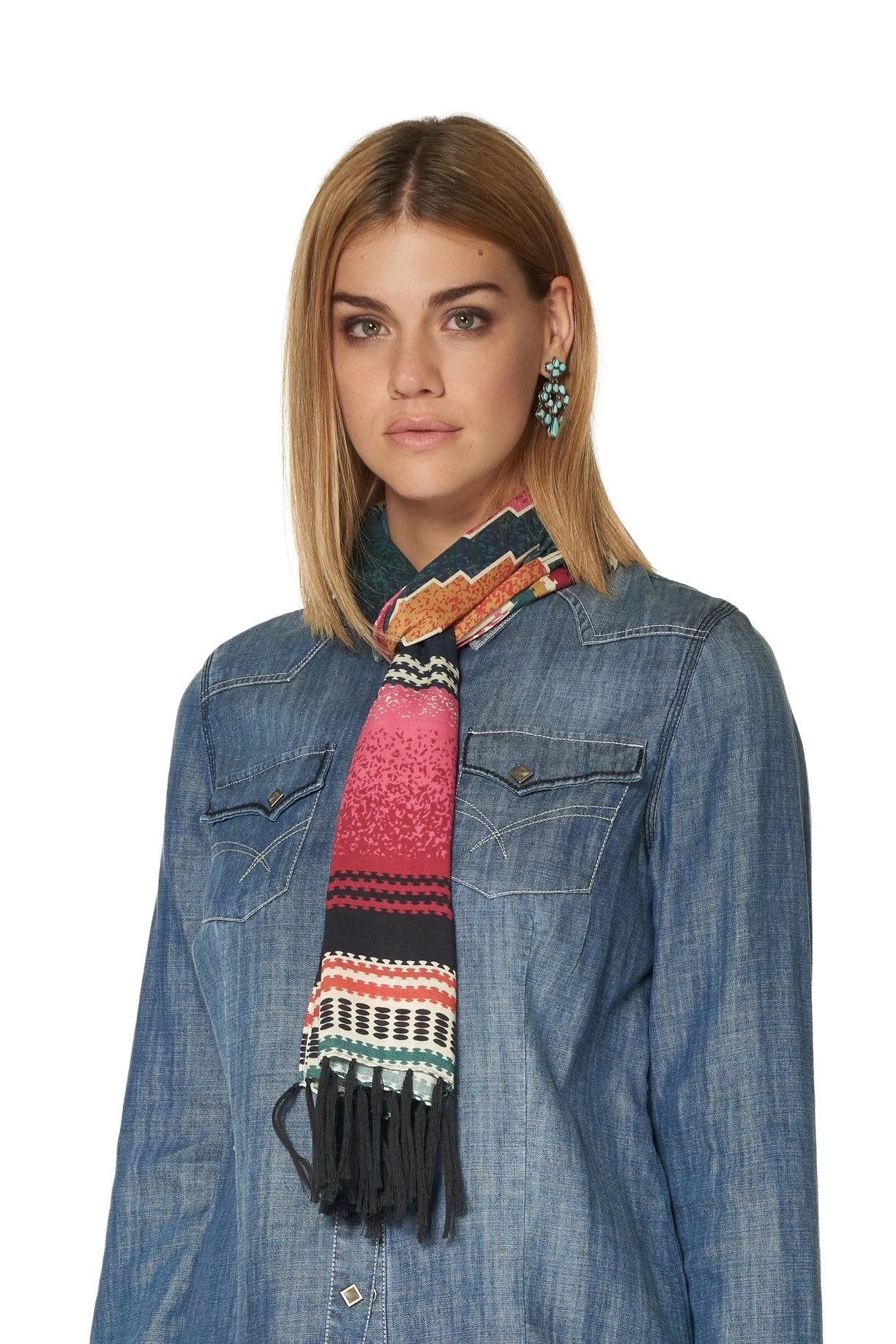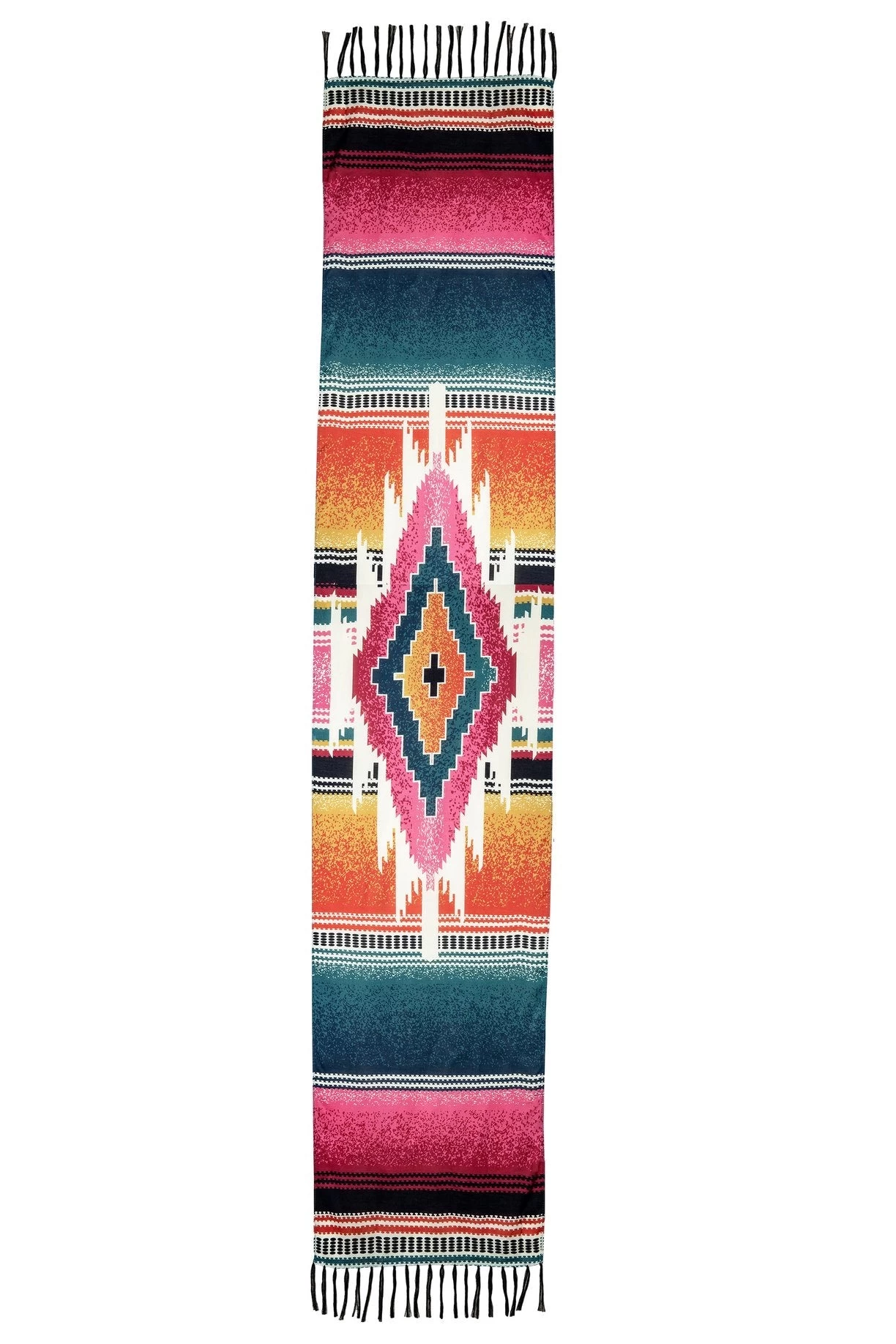 This vibrant scarf is crafted in the colorful signature serape custom-designed for the Cynthia collection and exclusive to Double D Ranch. The scarf is centered by a complementary serape eye and is tasseled on either end. A gorgeous way to add a vivid pop of color and Southwestern style to your look.