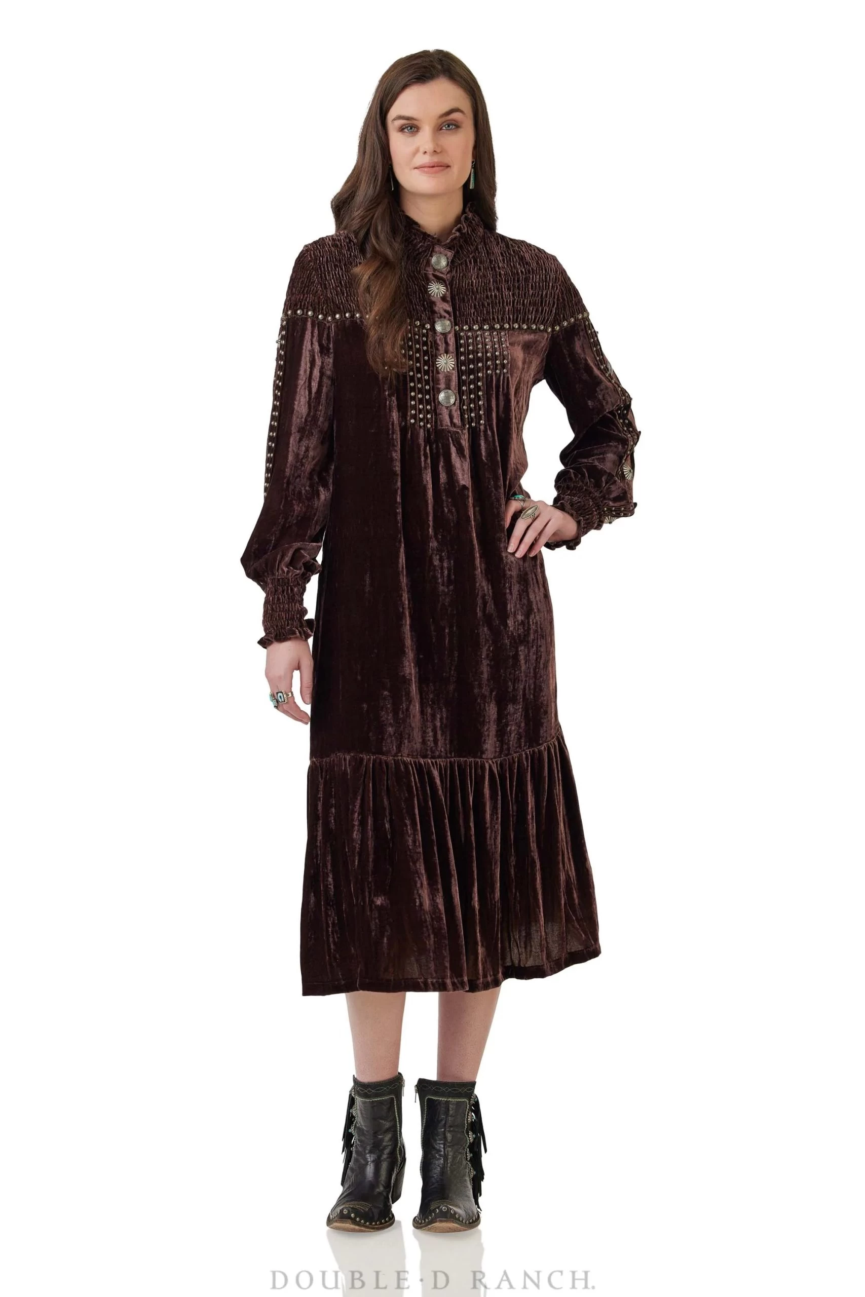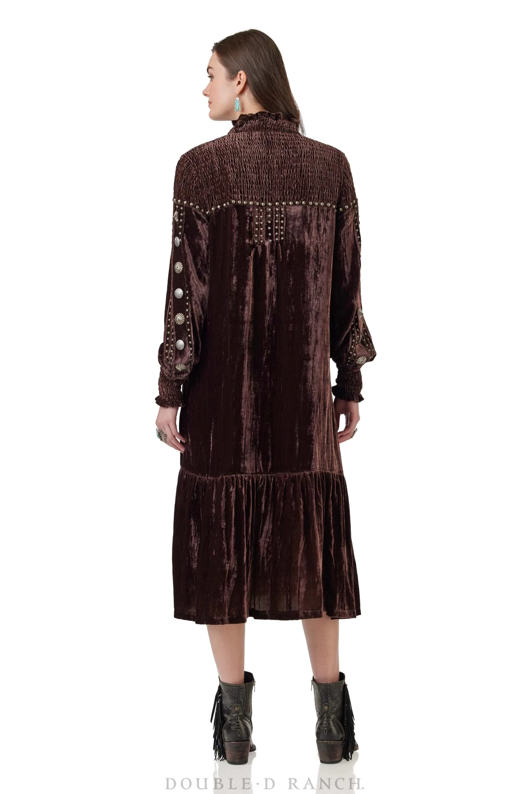 We’ve long been preaching the versatility of velvet – it’s so easy to dress up or down – and with the Flat Willow, we experimented with doubling down on texture by smocking the yoke and cuffs and adding subtle ruffles for a feminine touch. Of course, we finished it with the classic DDR touches of studding and custom conchos. The silhouette is a lovely flowy fit that’s perfect to pair with a pair of shortie boots.