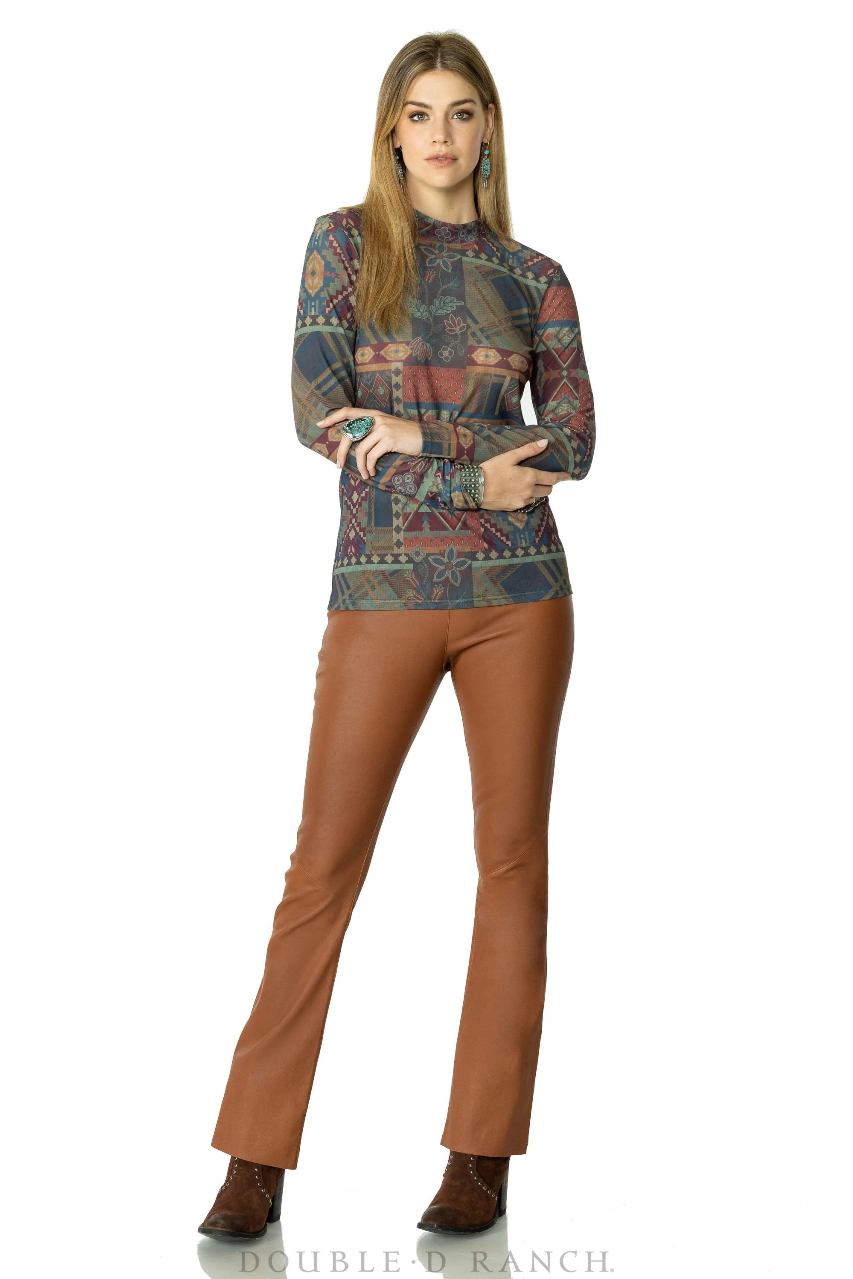 With every collection, we create a signature print that embodies the elements of that collection. For the Adirondacks, that’s the Great Camps custom print, in muted jewel tones of olives, wines, and teals, incorporating the plaids, geometrics, and florals you’ll find throughout the collection. This lightweight, the long-sleeved top has a mini mock-neck collar, and will be perfect for pairing with everything in this collection and throwing on under a vest!