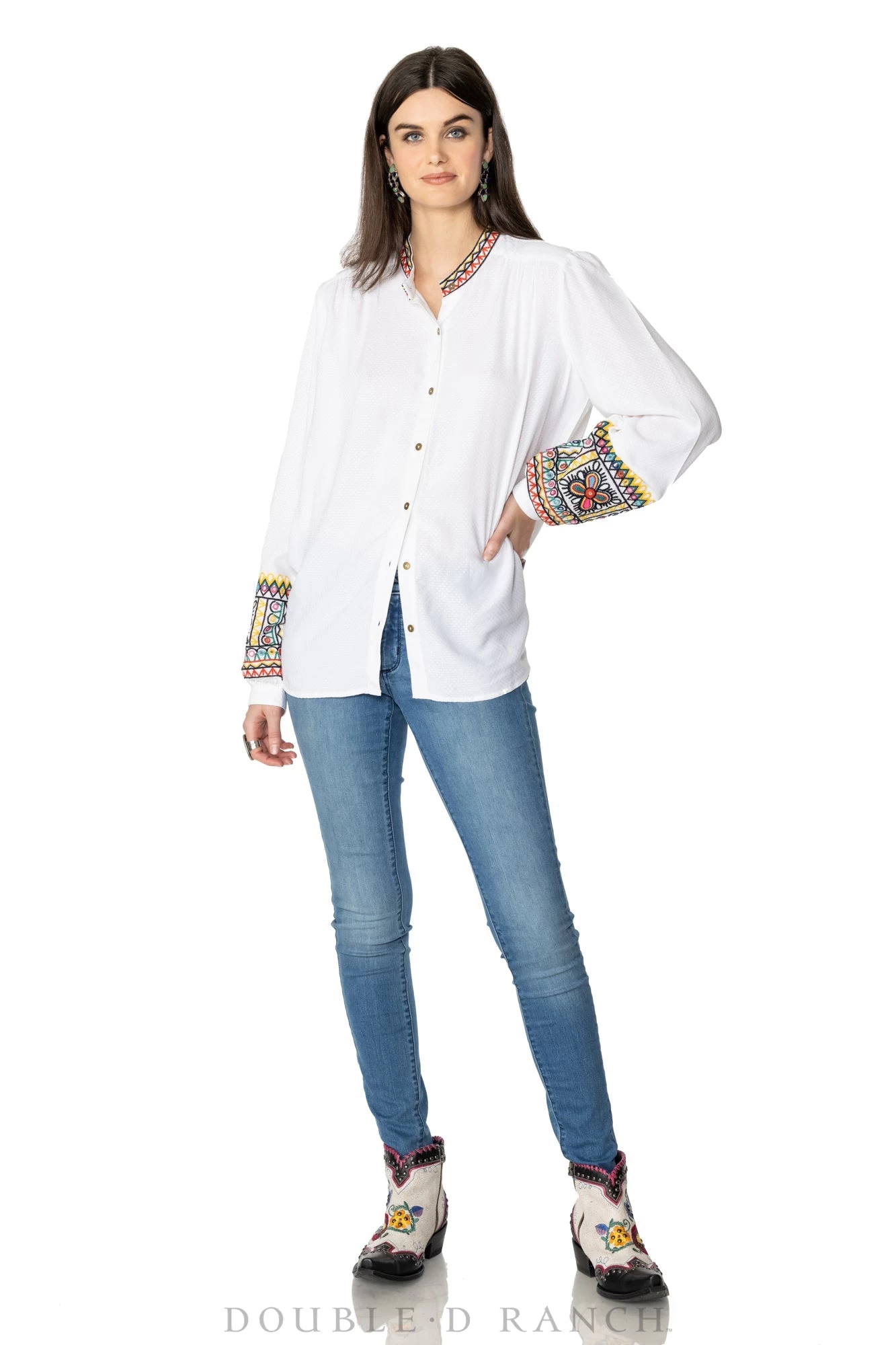 Staple meets statement in this beautiful button-down. The Haithi Top has a loose straight-line silhouette with bishop-style sleeves adorned with vibrant embroidery at the cuffs and collar. It’s a fabulous throw-and-go top to pair with your favorite jeans or leggings and still look put-together, but we also love it under the Alycia Vest for a look that’s full on fabulous!