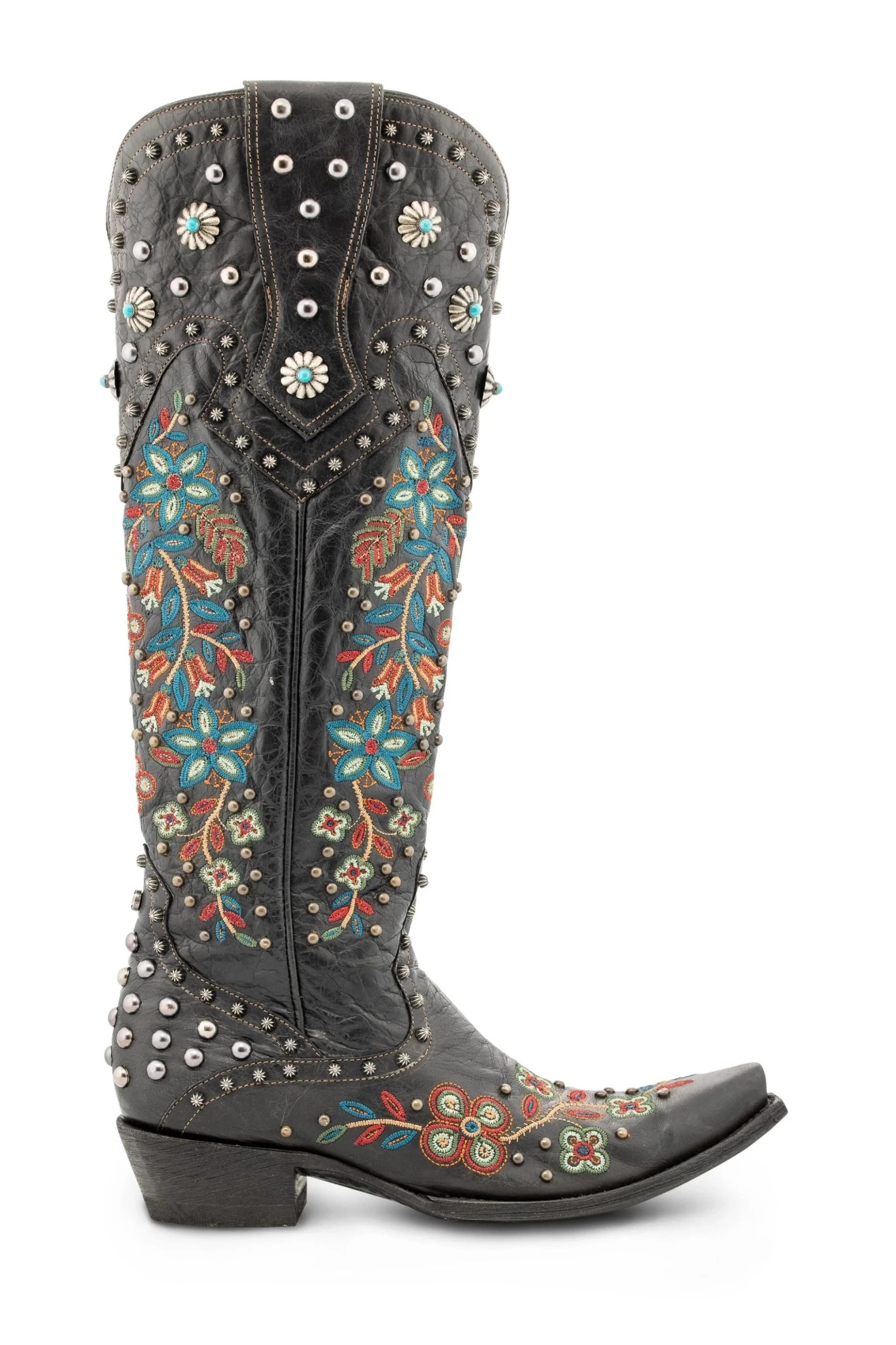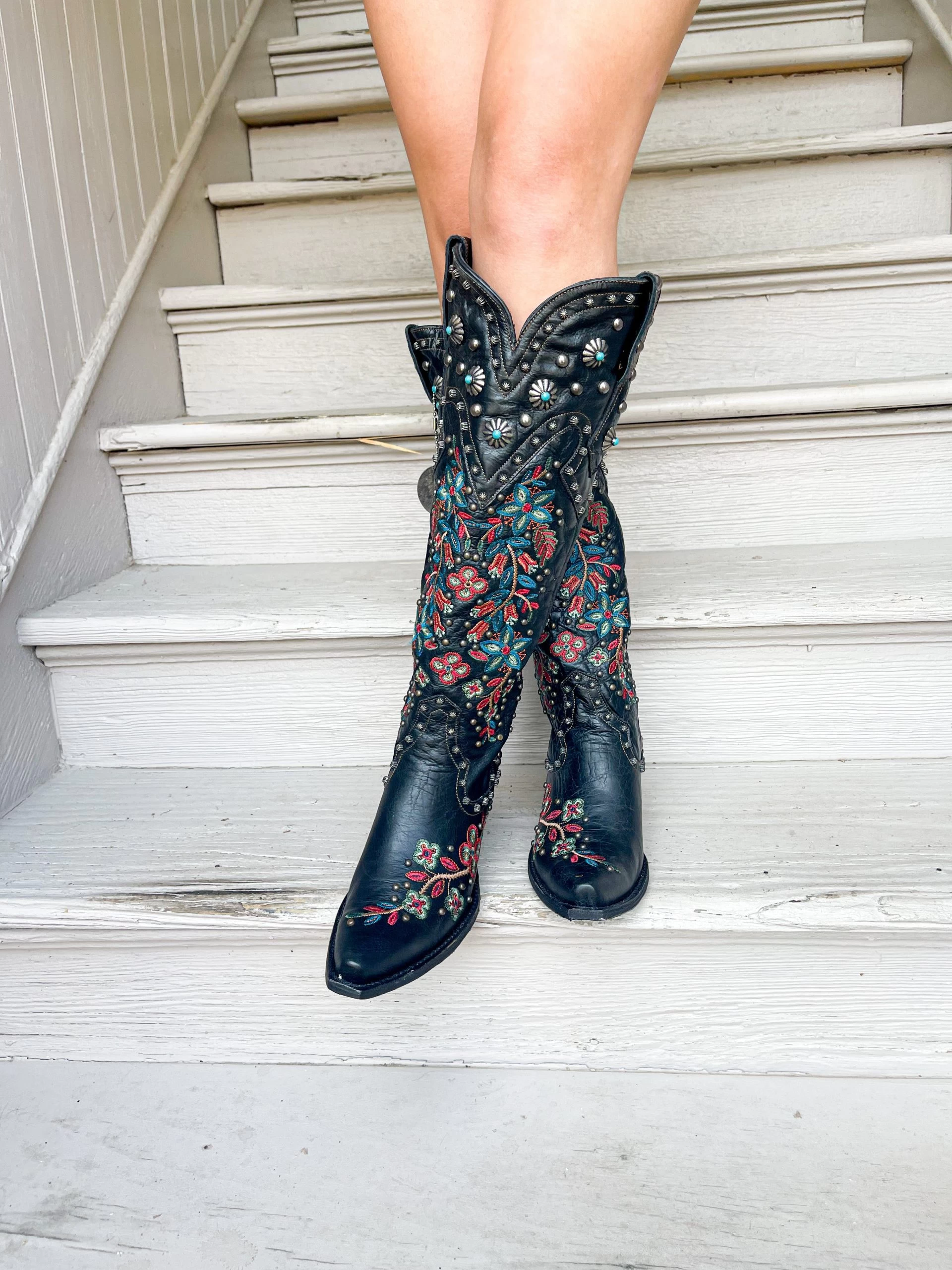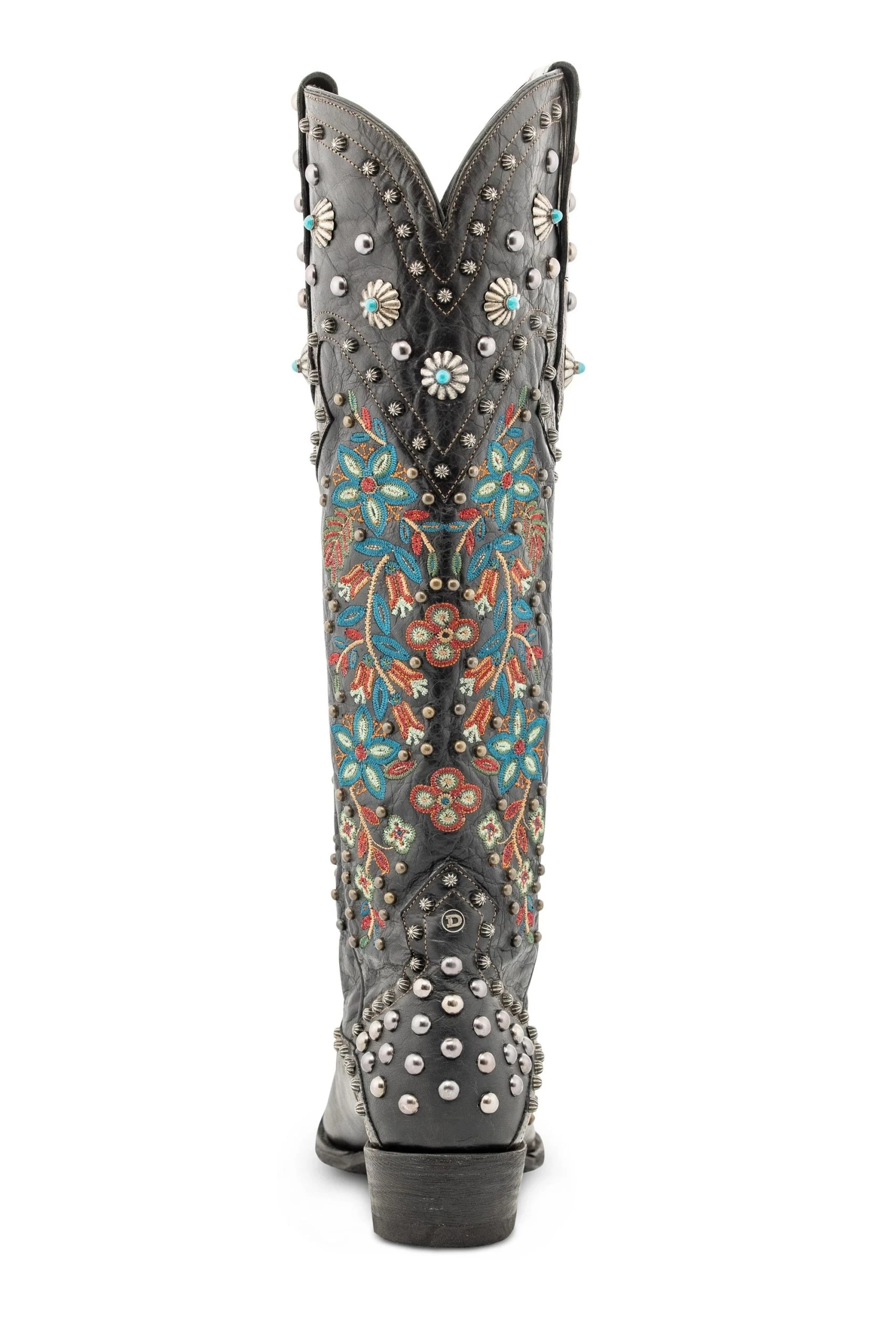 These boots are fabulous from top to toe. They are a tall, sexy silhouette of bold black leather embellished with intricate embroidery in a beautiful and colorful floral motif that debuted in the Adirondacks collection. They’re accented by a collection of small studs and custom conchos for a look that balances feminine and fierce!