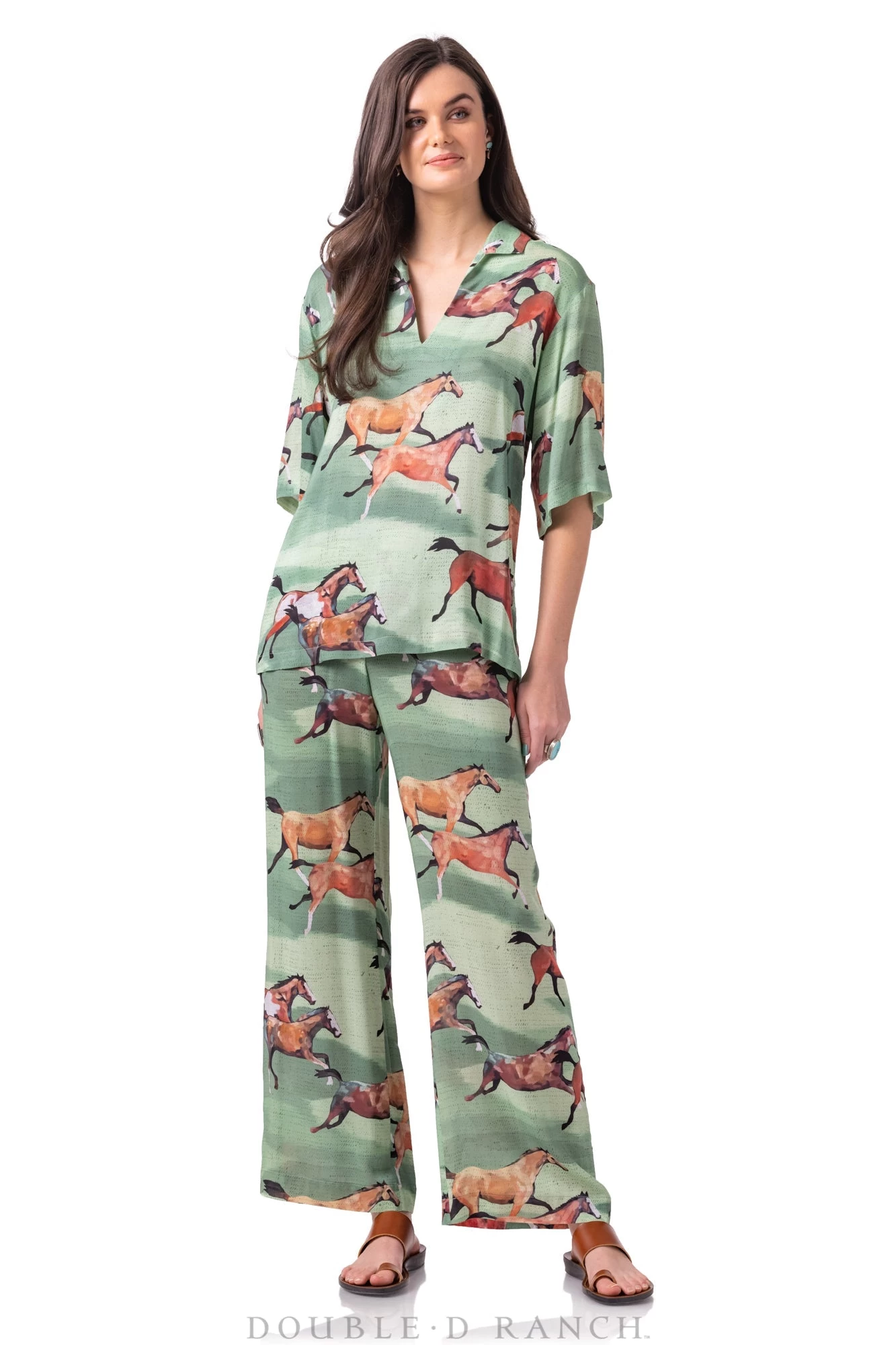 This chic top features a pattern that is an adaptation of a painting by our collaborating artists, Peggy Judy, featuring wild horses in motion against a spring green background. The silhouette is a unique one for us; a chic collared V-neck with drop-shoulder relaxed ¾ sleeves. Not only should it be on your wish list for its beauty, but also because a portion of proceeds for every Wild Horse Dress purchased will be donated to the Wild Horse Preservation League to aid them in continuing their efforts to protect these majestic creatures and educate their human neighbors on how to harmoniously coexist without harmfully interfering.