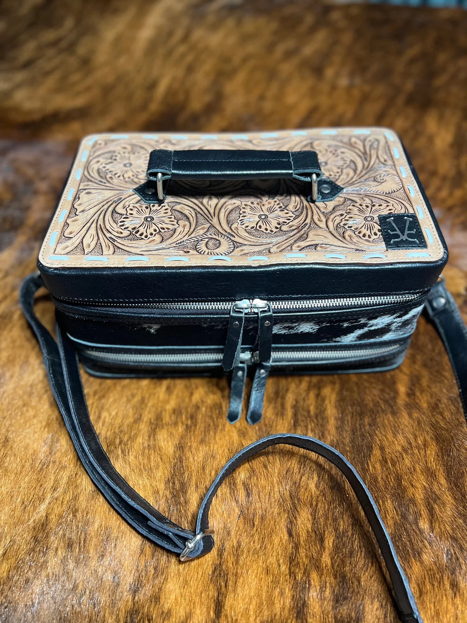 Double Decker travel jewelry case with removable squash blossom tray. Measures 13 x 8 x 6.5”. Has removable shoulder strap, longer removable cuff holder and ring holder, and bottom compartment has removable squash blossom tray..can remove the tray and bottom compartment holds tons more jewelry. Black/ white cowhide or brown/white cowhide (pattern varies) with tooled leather/buckstitch laced top and black velvet interior.