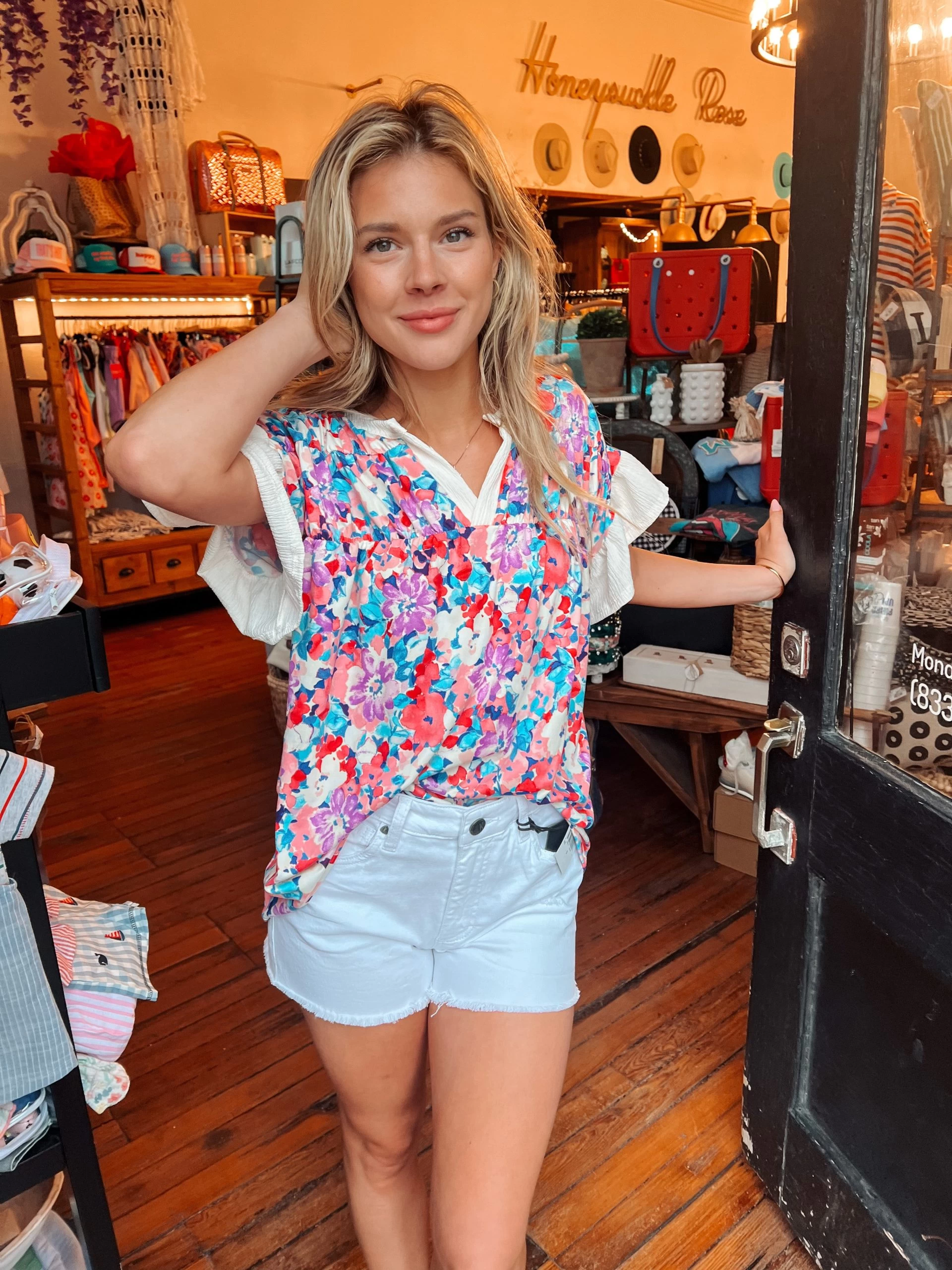 The ellen blouse is a super soft flowy blouse with a fun floral print anf ffrilly sleeve! This top runs true to size!