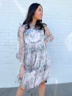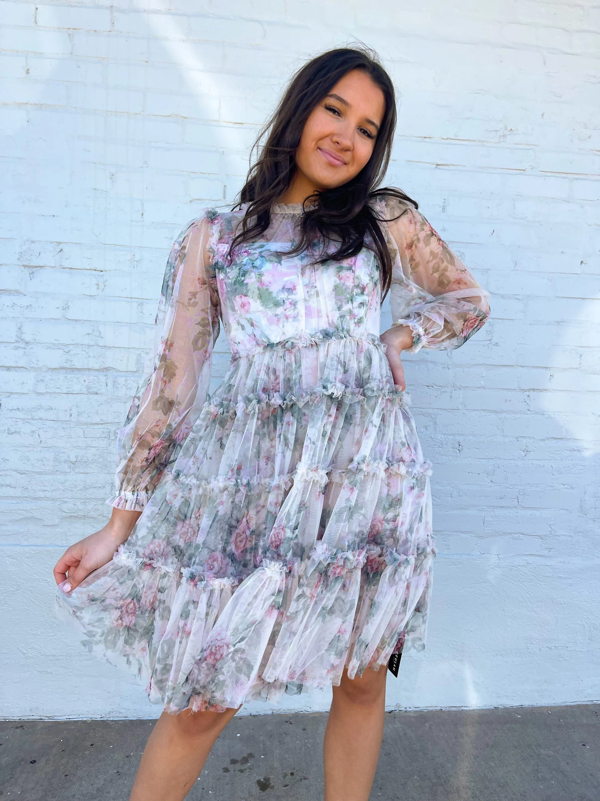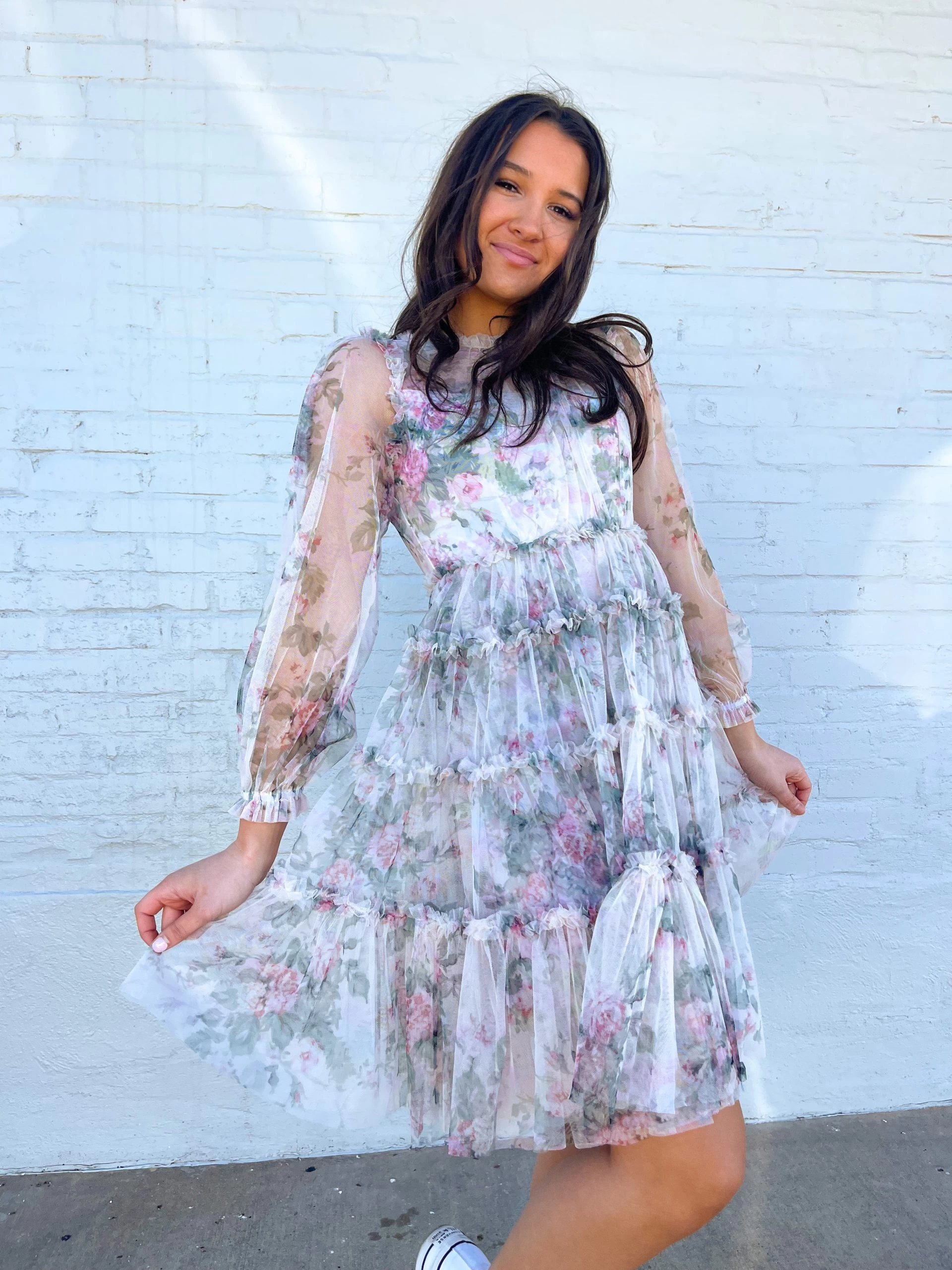This dress is DREAMY!! Floral mesh overlay with tiered skirt that hits right above the knee. She features a mock neckline with a sheer sleeve detail! This is the perfect option for your Sunday best!