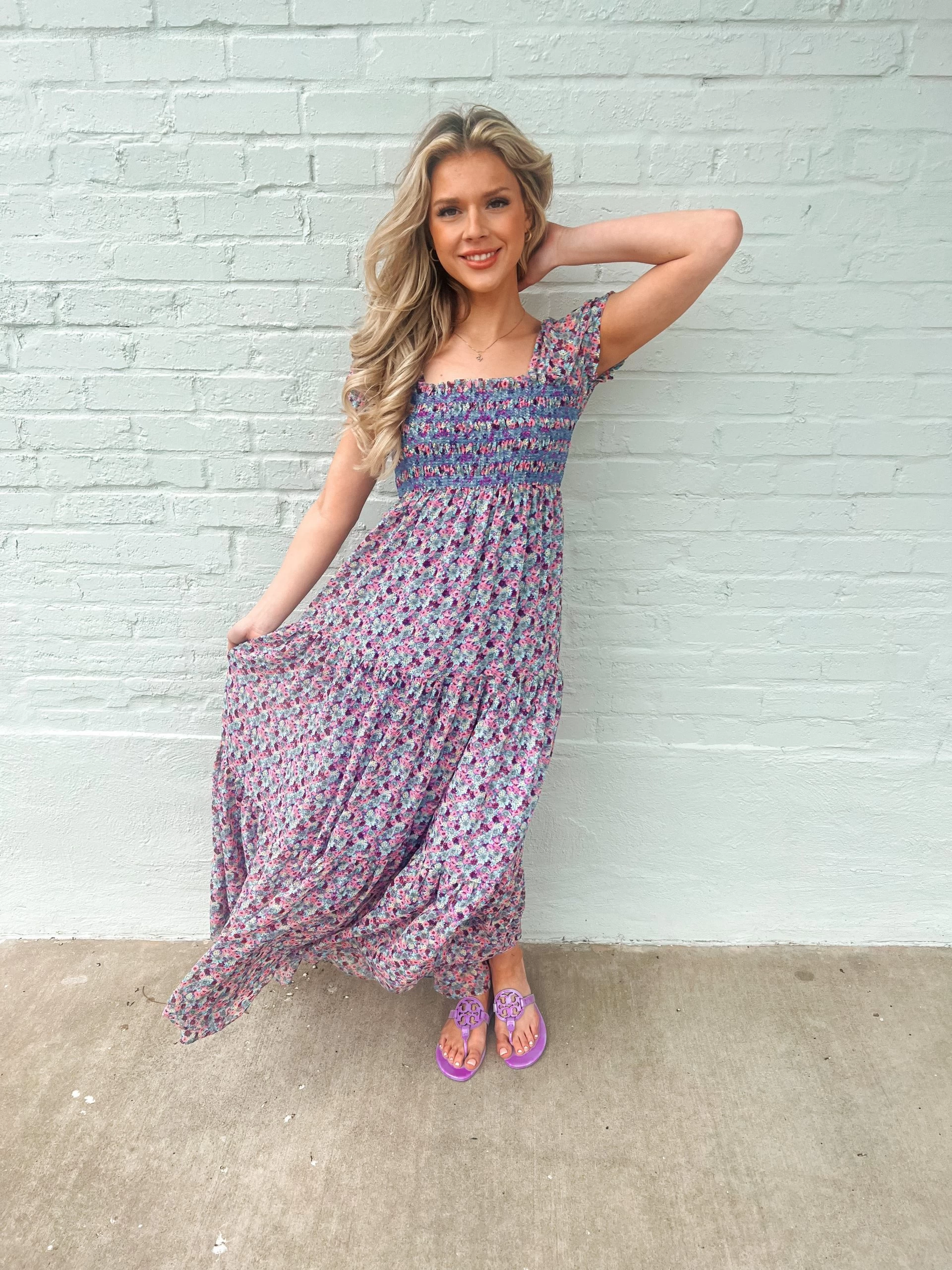 Calling all maxi dress lovers! The Hattie is a LOOK. She features a smocked bodice with a short flattering puffy sleeve, and large tiers down to the ground. Pair her with a big hat and an arm full of bangles for a cute boho look.