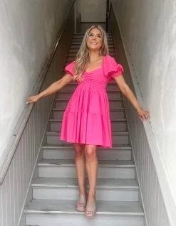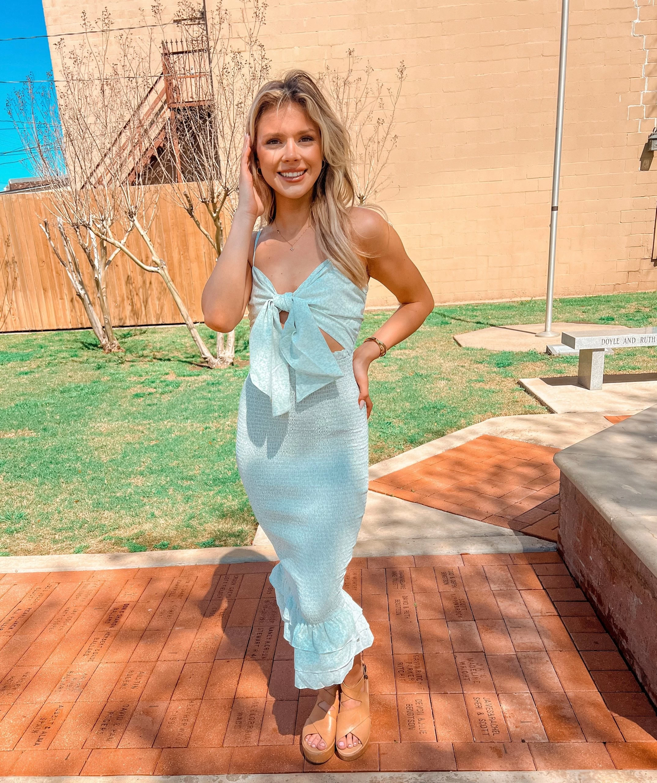 This fully smocked mini dress has all the flirty and girly details you want in a spring and summer wardrobe! This top features and adjustable tie front detail and smocked body with a ruffle hem.