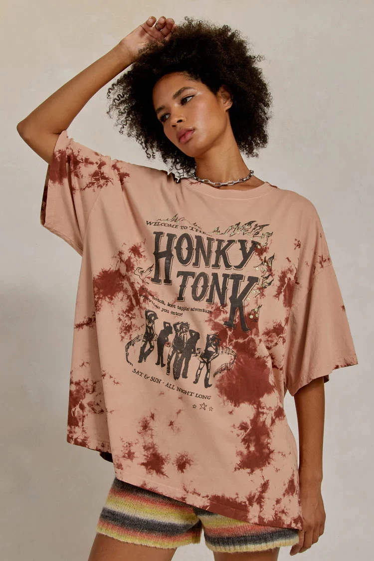 Ready for a top-notch, boot tappin’ adventure? Embodying the essence of the country music capital of the world, this cloud wash OS tee places a spotlight on the iconic culture of the nation’s oldest honky tonks. Designed with a dancing cowboy graphic and musical motifs accented in puff glitter. Access granted to the official Honky Tonk.