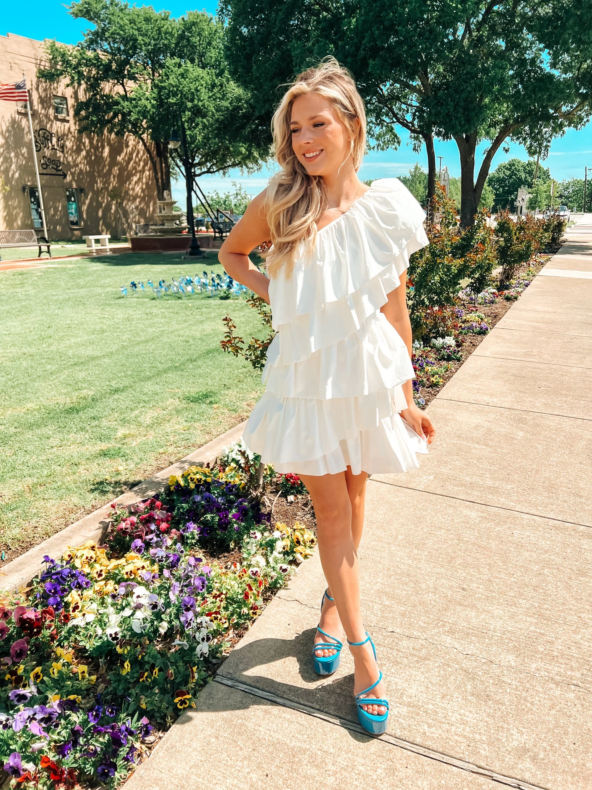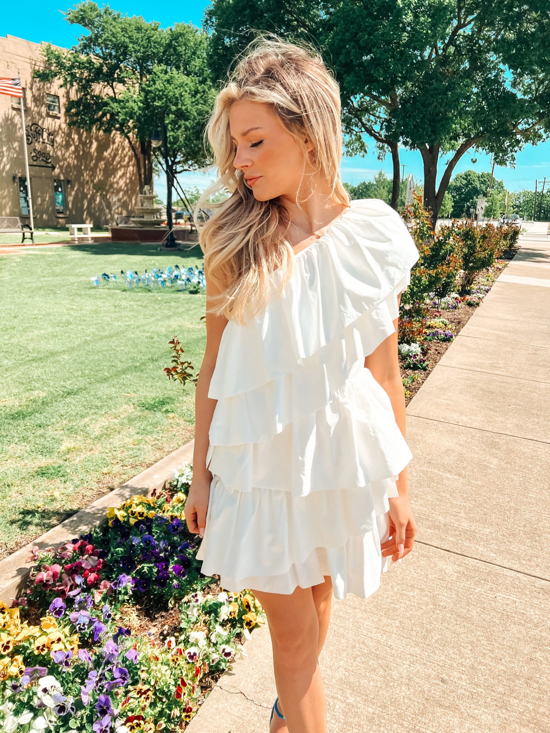 This ruffle asymmetrical dress is the perfect special occasion white dress for all things bridal, graduation, and greek rush!