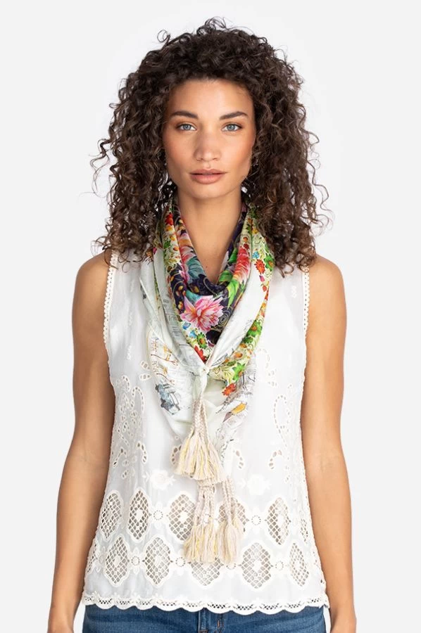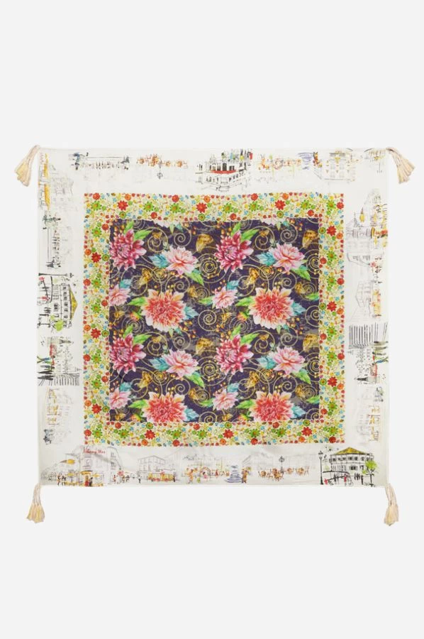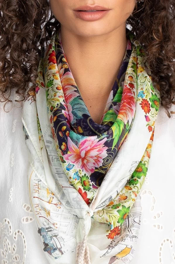 With its captivating summer-inspired colorways, whimsical floral details, and modern cityscape frame, our Uptown Scarf is truly something special. The perfect finishing touch to any boho look, pair this silk piece with your favorite outfit or tie to the strap of a leather bag for an on-trend pop of color.