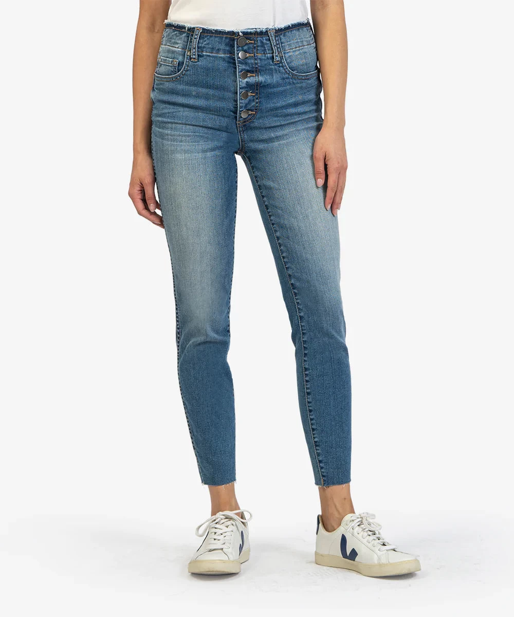 - Exposed buttons and raw hems make these stretchy skinny jeans a little less basic, while Fab Ab front pockets comfortably flatten and shape.