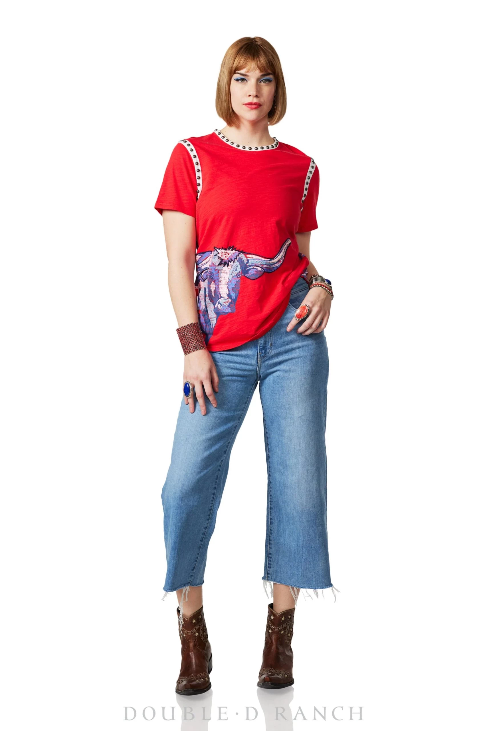 This colorful cotton top gives you 360 degrees of eye-catching awesomeness. The bold “rocket red” is complemented by a contrasting collar and sleeve trim accented with metallic studs; the front features a peek-a-boo longhorn embellished with embroidery while the back boasts a pretty print of red-white-and-blue hued stripes.