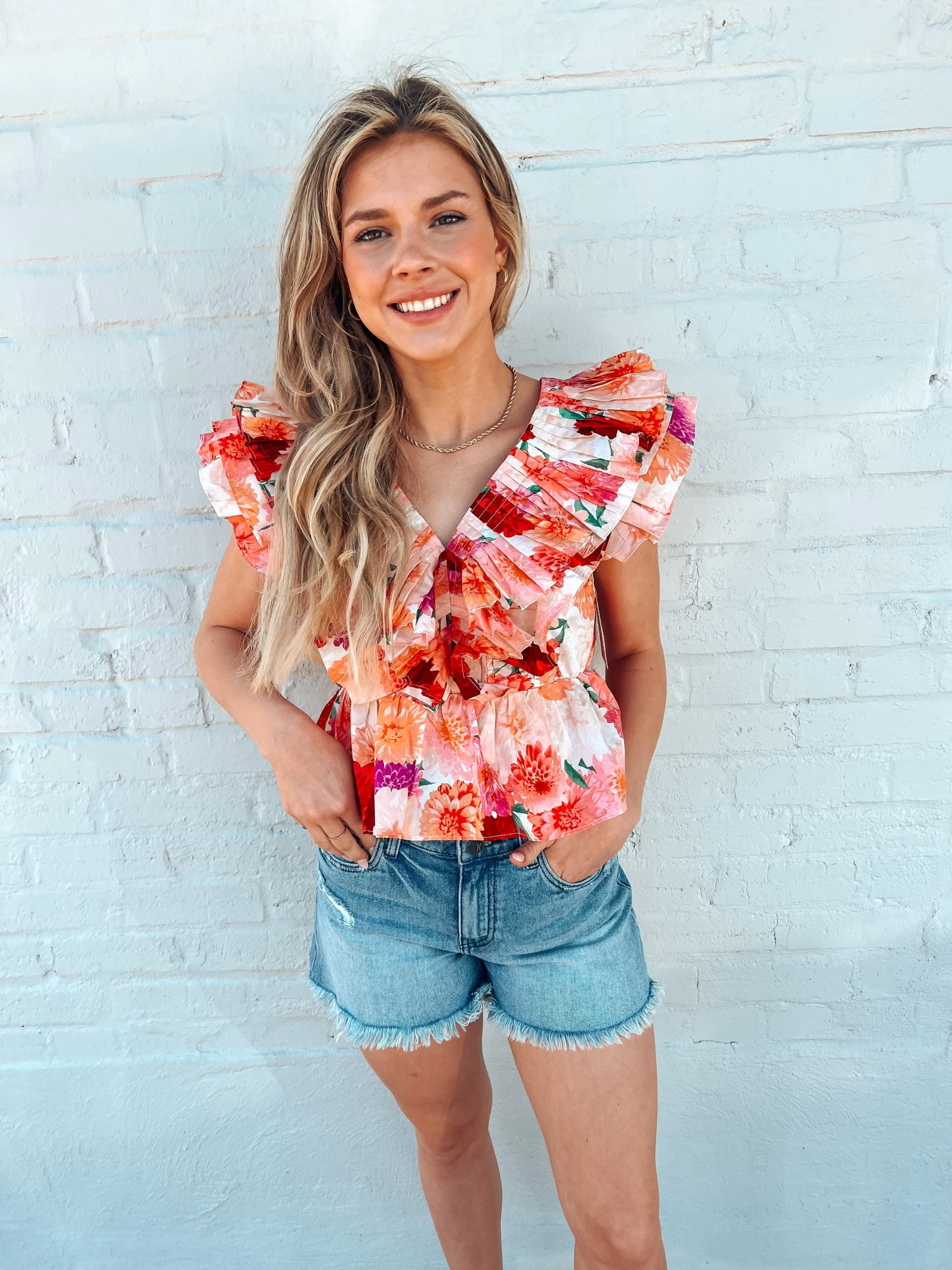 Nothing makes quite an eye-catching entrance like the new Nia Top! This ideal summer top features a bright, floral-inspired print throughout, a pleated bib, a cute V-neckline in front and back, and a peplum flare. We love her paired with white denim and a heel!
