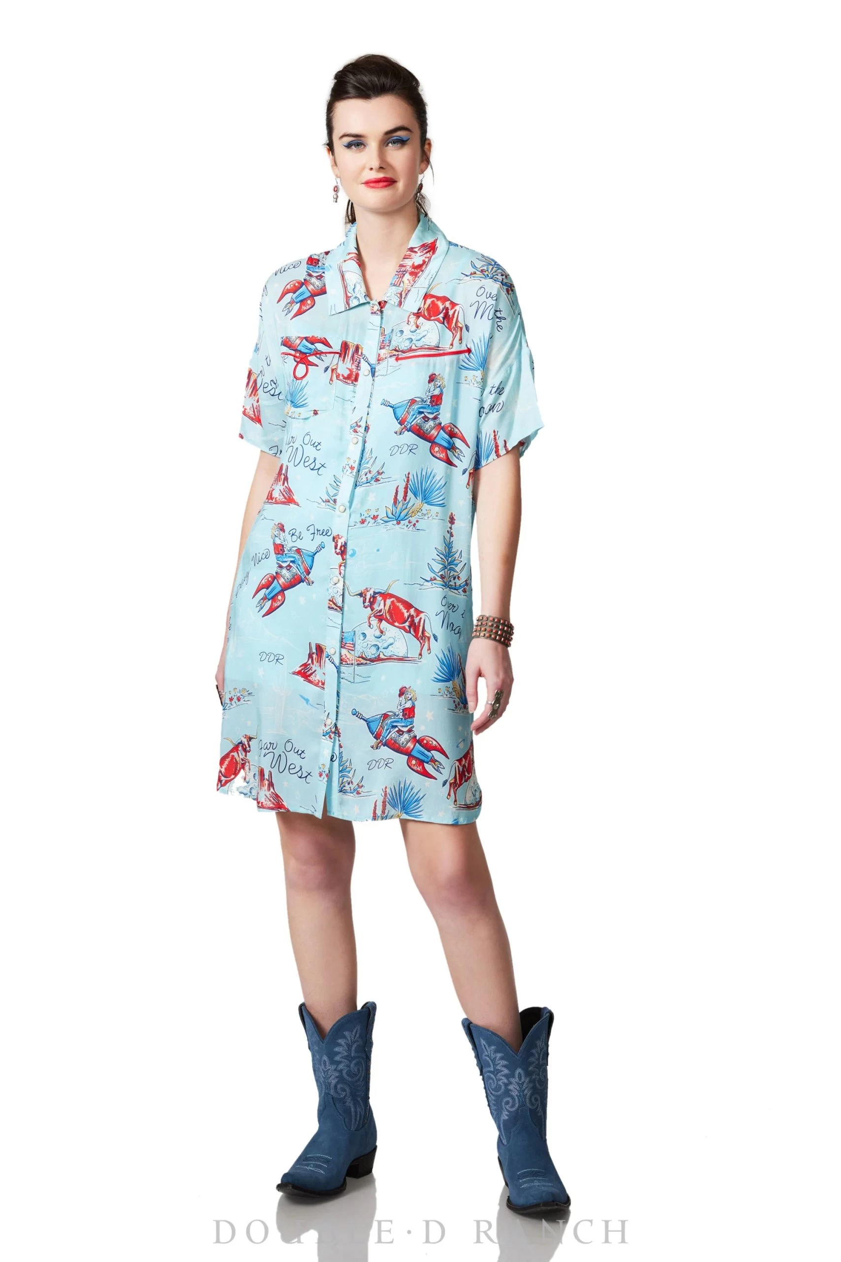 All the awesome elements of Throwback to the Future thrown together in one pretty print! This custom design has retro-futuristic figured out – with a DDR spin! From rocket-riding cowgirls to far-out flora to the cow jumping over the moon, this season’s signature print has a lot to love on this light blue background. The sundress turns stellar with this short-sleeved silhouette, completed with a classic collar and a full-front pearl snap placket.