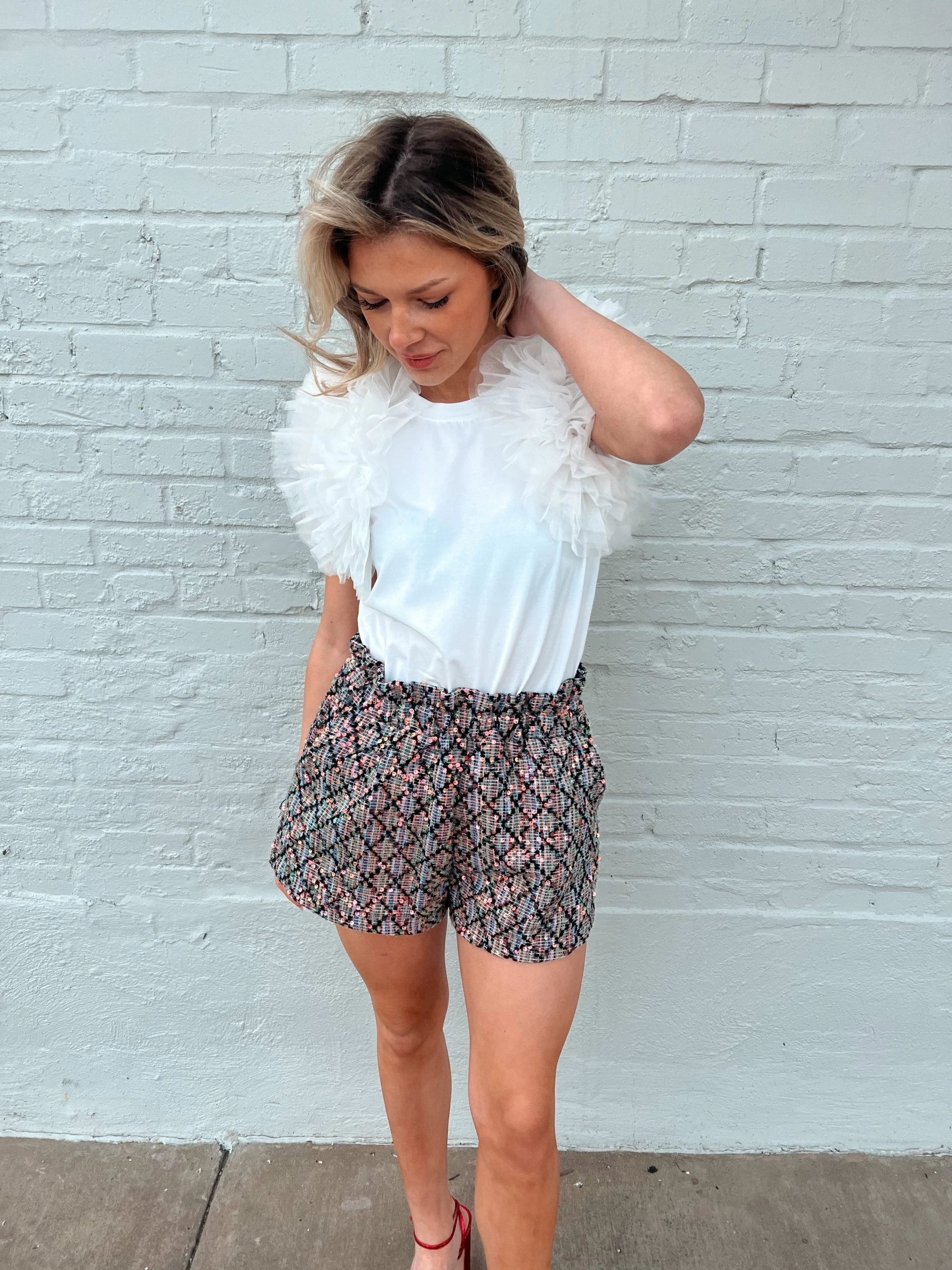 Black iridescent sequin tweed shorts from Queen of Sparkles!