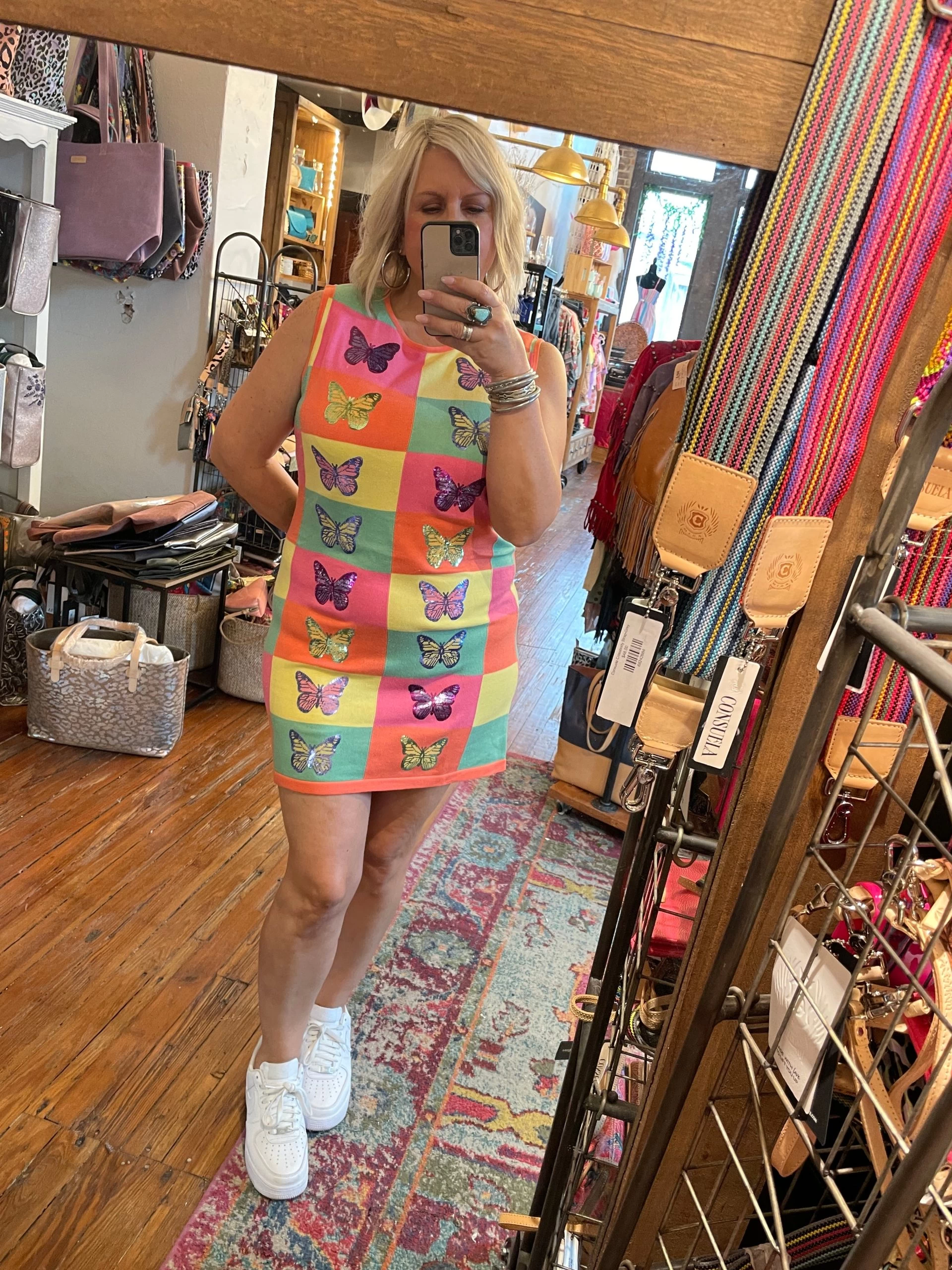 This colorblock fit and flare mini dress is a perfect lightweight sweater material with sequin butterfly details! Morgan is wearing a size XS and Holly is wearing a size L!