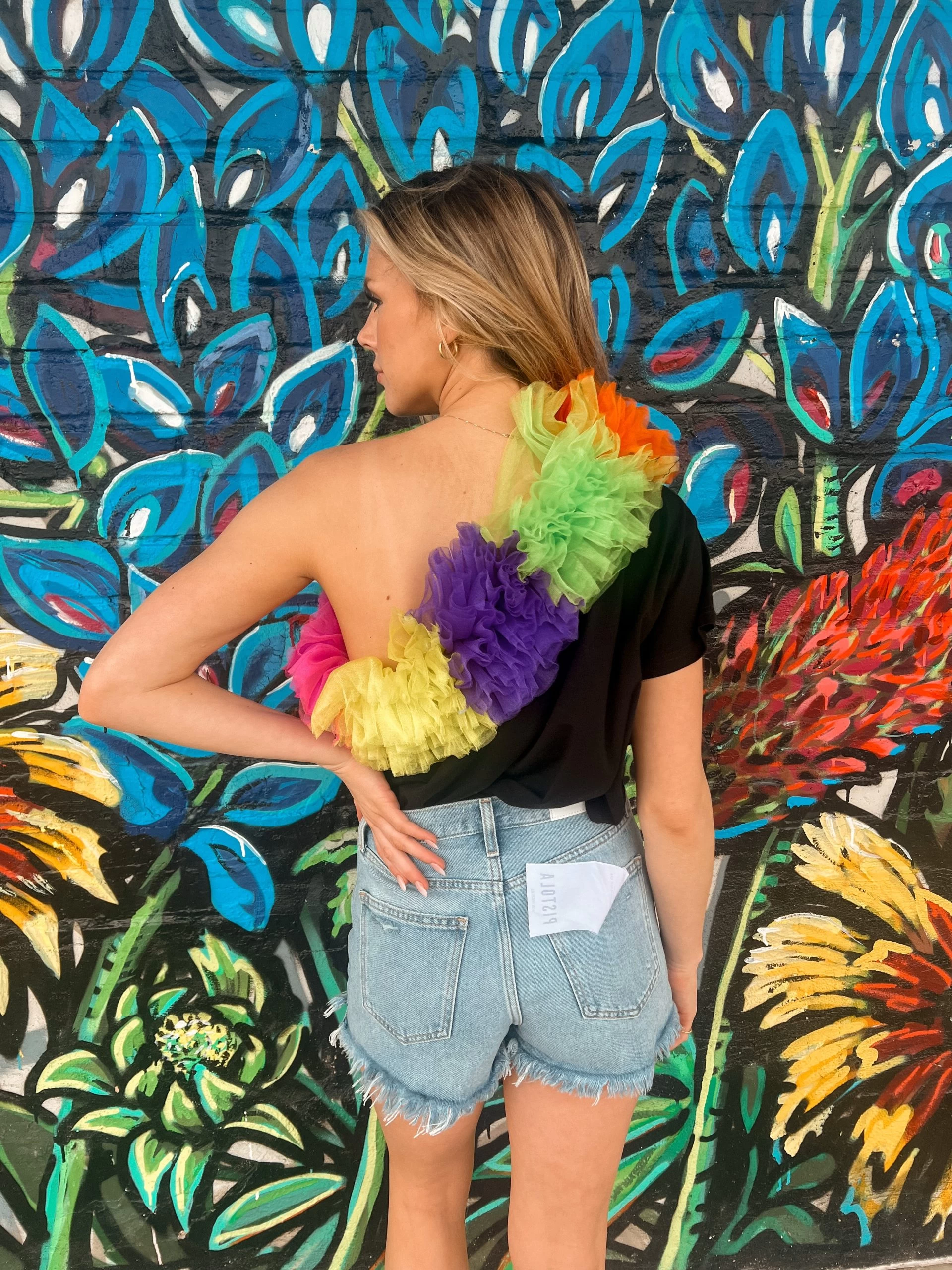 This rainbow tulle one shoulder top is the perfect top for anyone that is queen of the party! This top runs true to size!