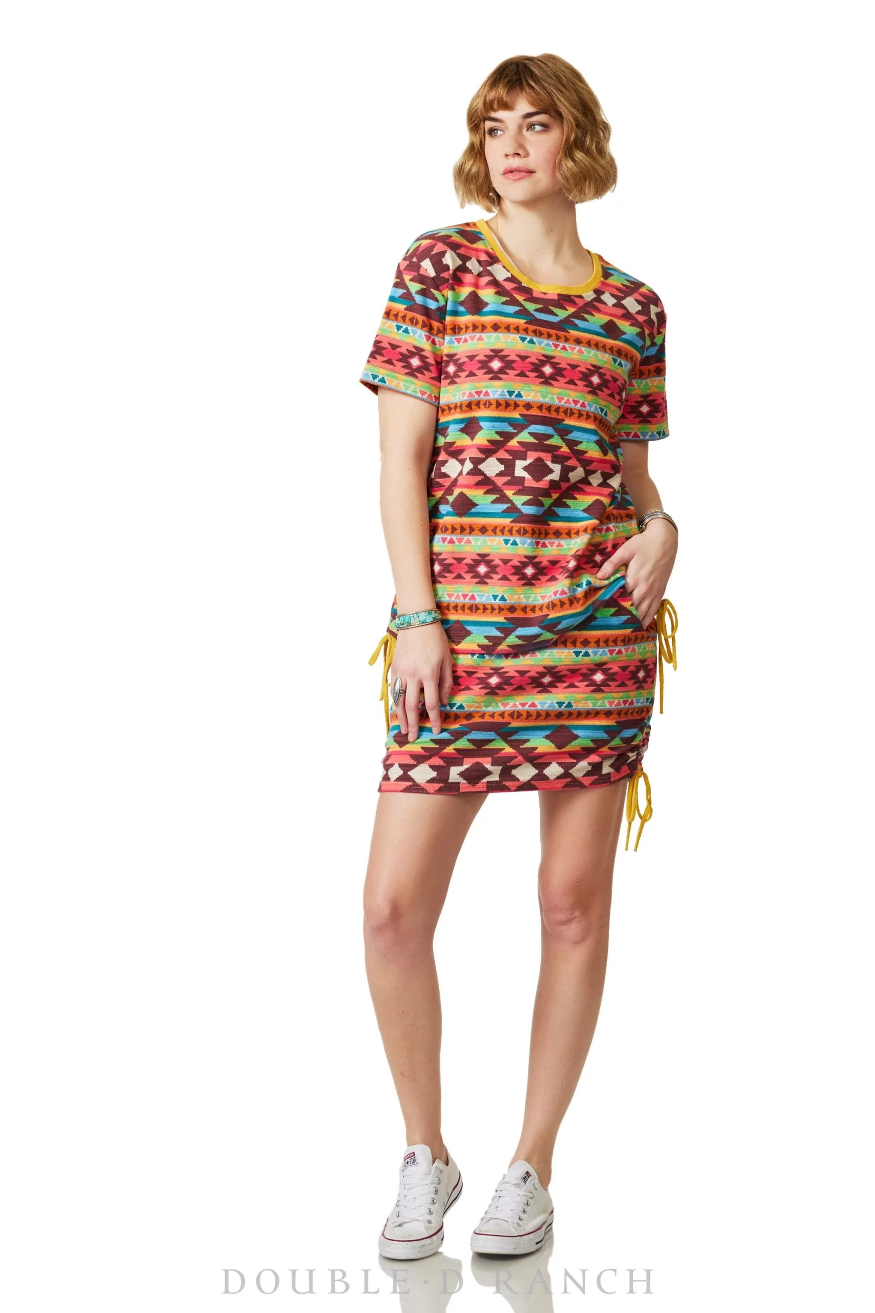 A chic blend of blanket pattern and traditional serape print brings this color palette to life with stunning southwestern style. This classic crewneck short-sleeve tee is finished with contrasting ties at the sides. It makes a maximal statement with minimal effort.