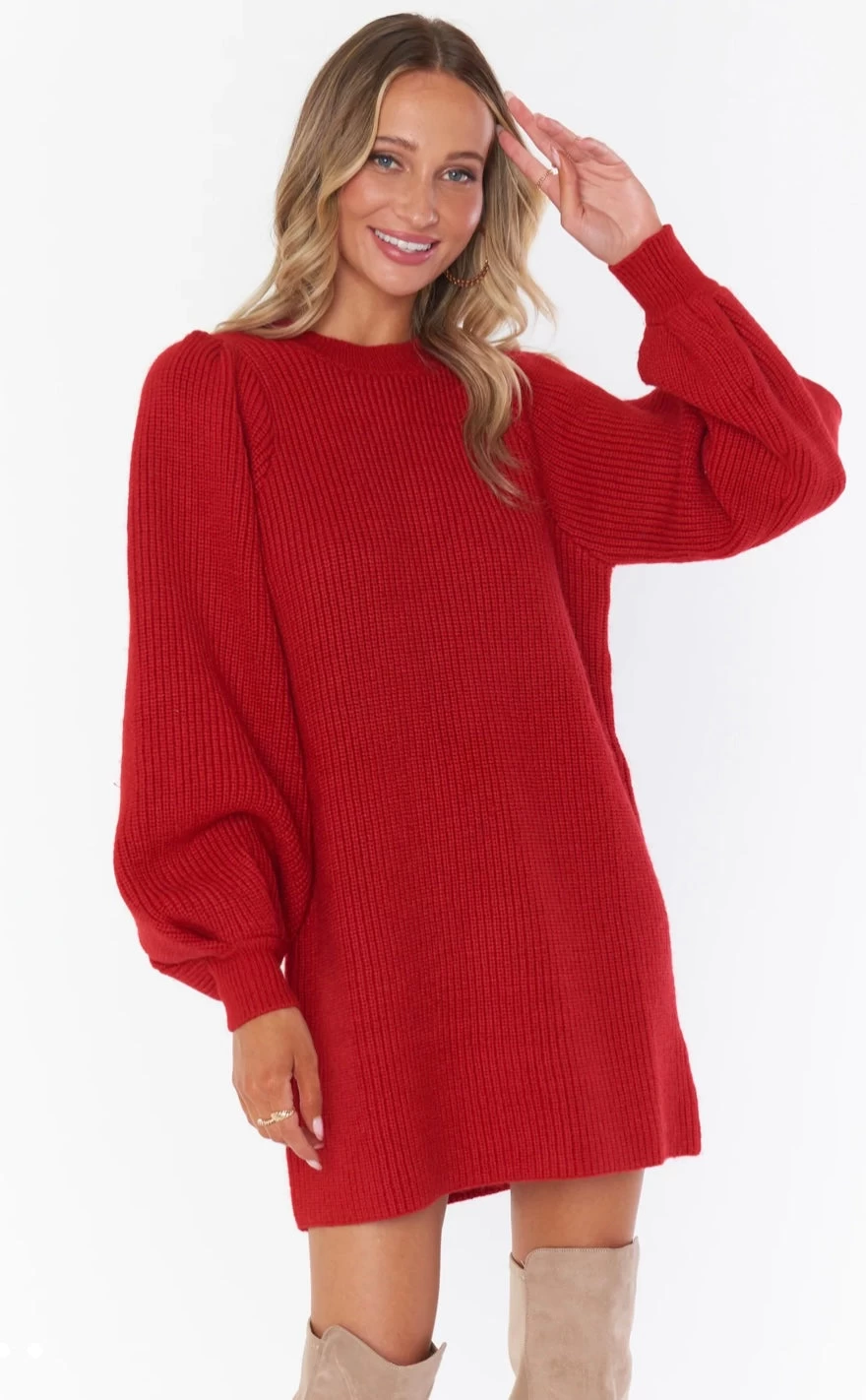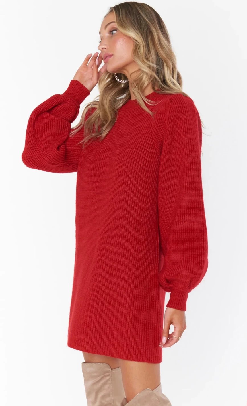 Sweater dress weather has never been better! Cozy red knit as soft and luxe as can be. Mini dress length and a poof sleeve elevates this cozy number.