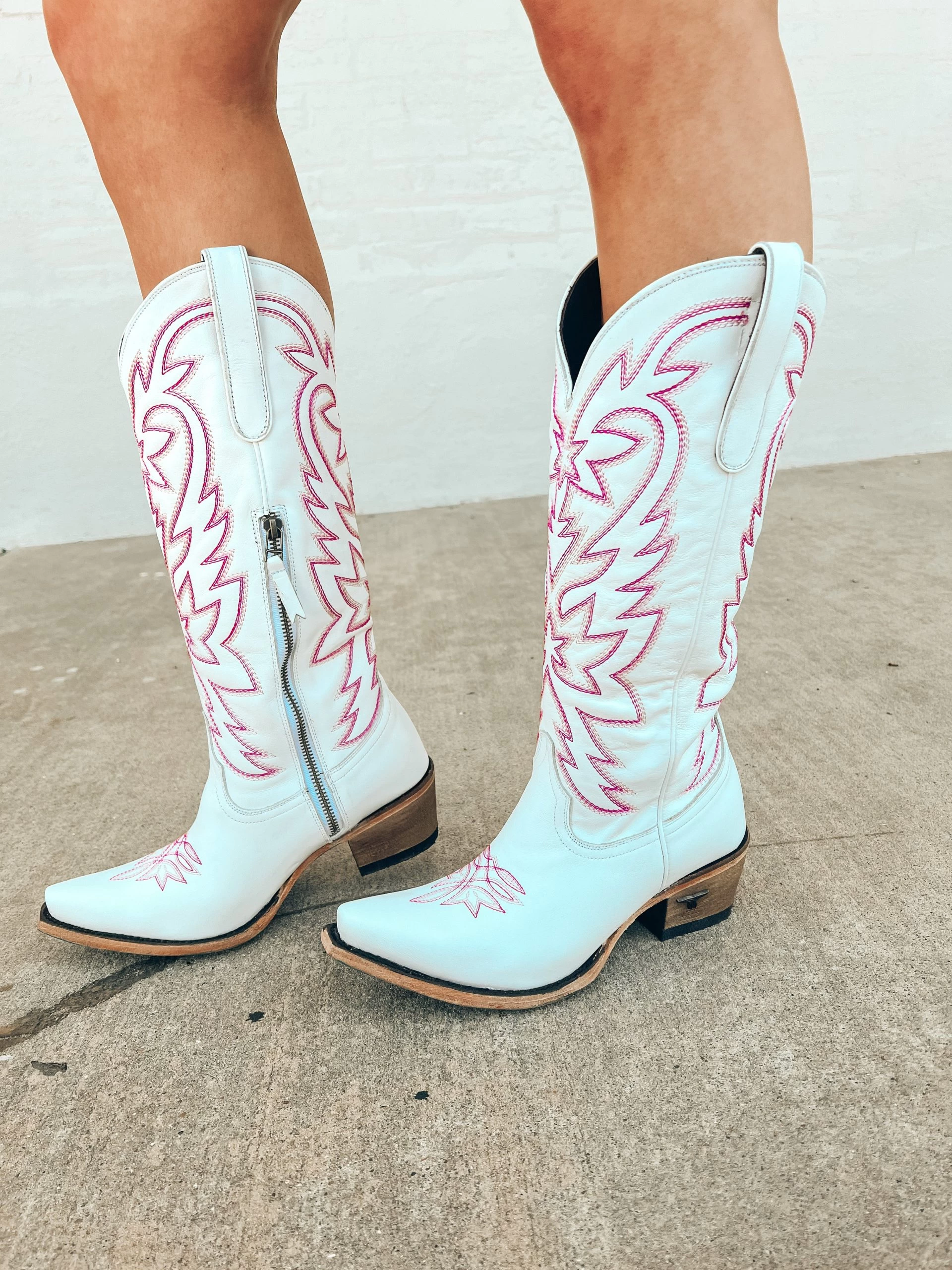 She’s the perfect chic, white cowgirl boot with a pop of pink right off the runway.